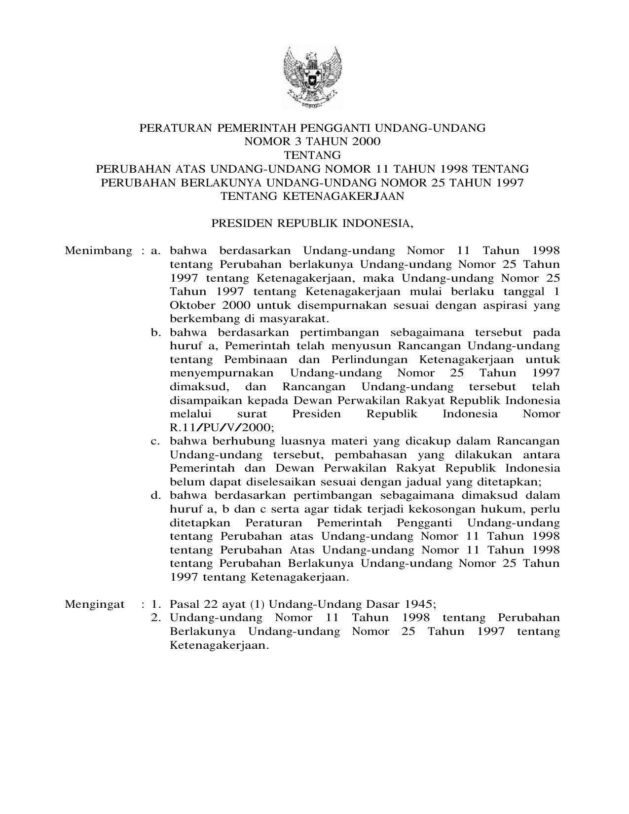 PERPPU Nomor 3 Tahun 2000 | Peraturan Pemerintah Pengganti Undang-Undang Nomor 3 Tahun 2000 tentang PERUBAHAN UU 11-1998 TENTANG PERUBAHAN BERLAKUNYA UU 25-1997 TENTANG KETENAGAKERJAAN