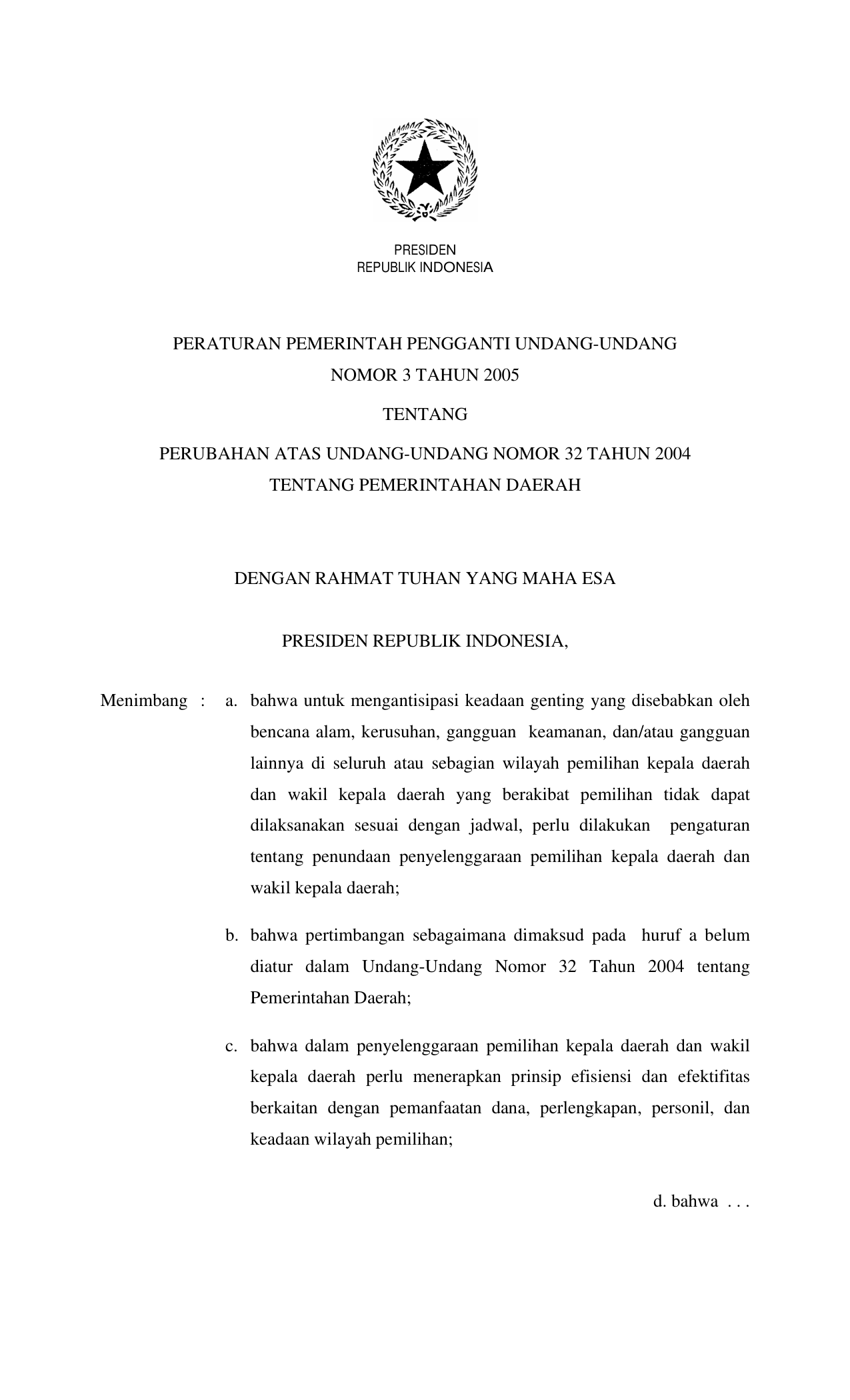 PERPPU Nomor 3 Tahun 2005 | Peraturan Pemerintah Pengganti Undang-Undang Nomor 3 Tahun 2005 tentang PERUBAHAN UU 32-2004 TENTANG PEMERINTAHAN DAERAH