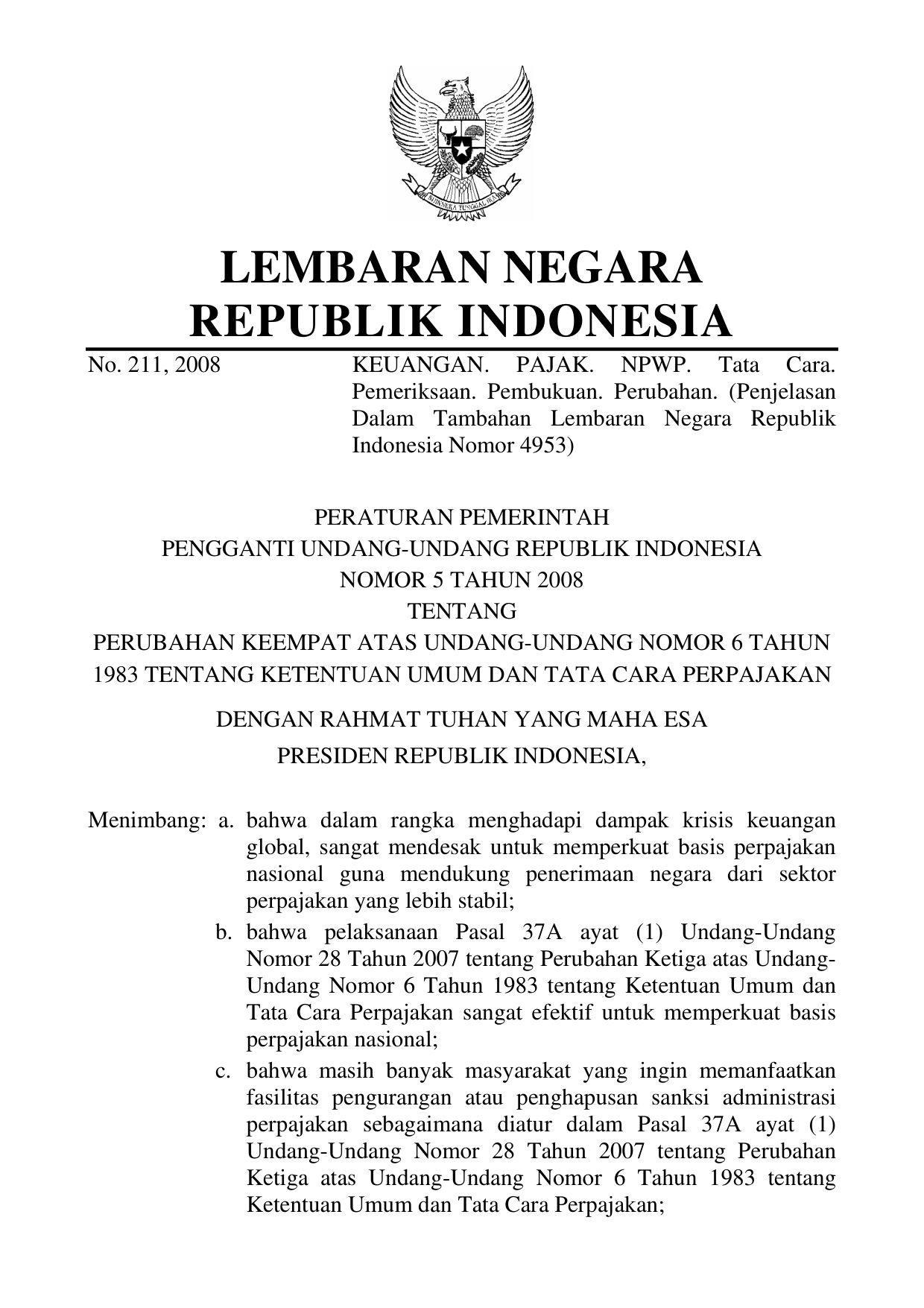 PERPPU Nomor 5 Tahun 2008 | Peraturan Pemerintah Pengganti Undang-Undang Nomor 5 Tahun 2008 tentang PERUBAHAN KEEMPAT UU 6-1983 TENTANG KETENTUAN UMUM DAN TATA CARA PERPAJAKAN