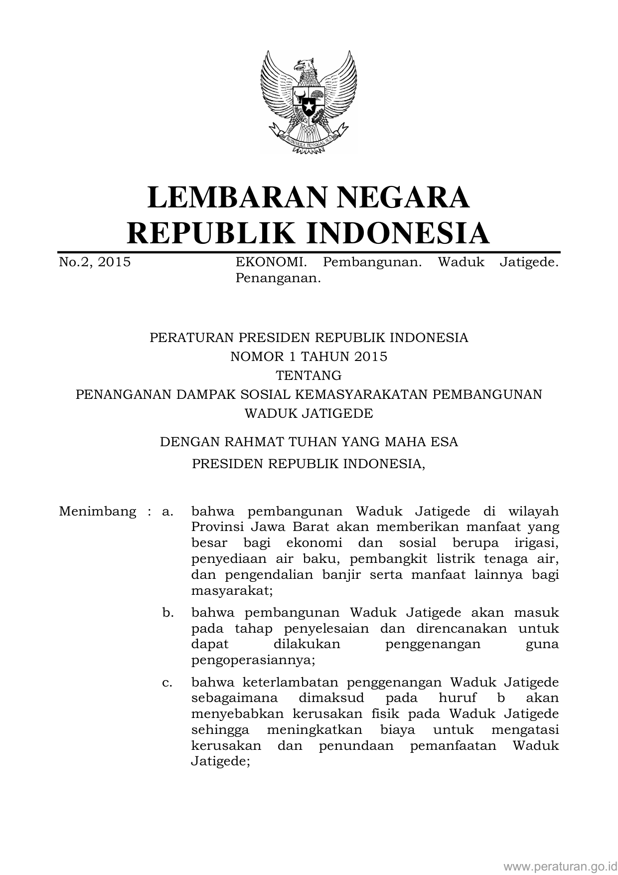PERPRES Nomor 1 Tahun 2015 | Peraturan Presiden Nomor 1 Tahun 2015 tentang PENANGANAN DAMPAK SOSIAL KEMASYARAKATAN PEMBANGUNAN WADUK JATIGEDE