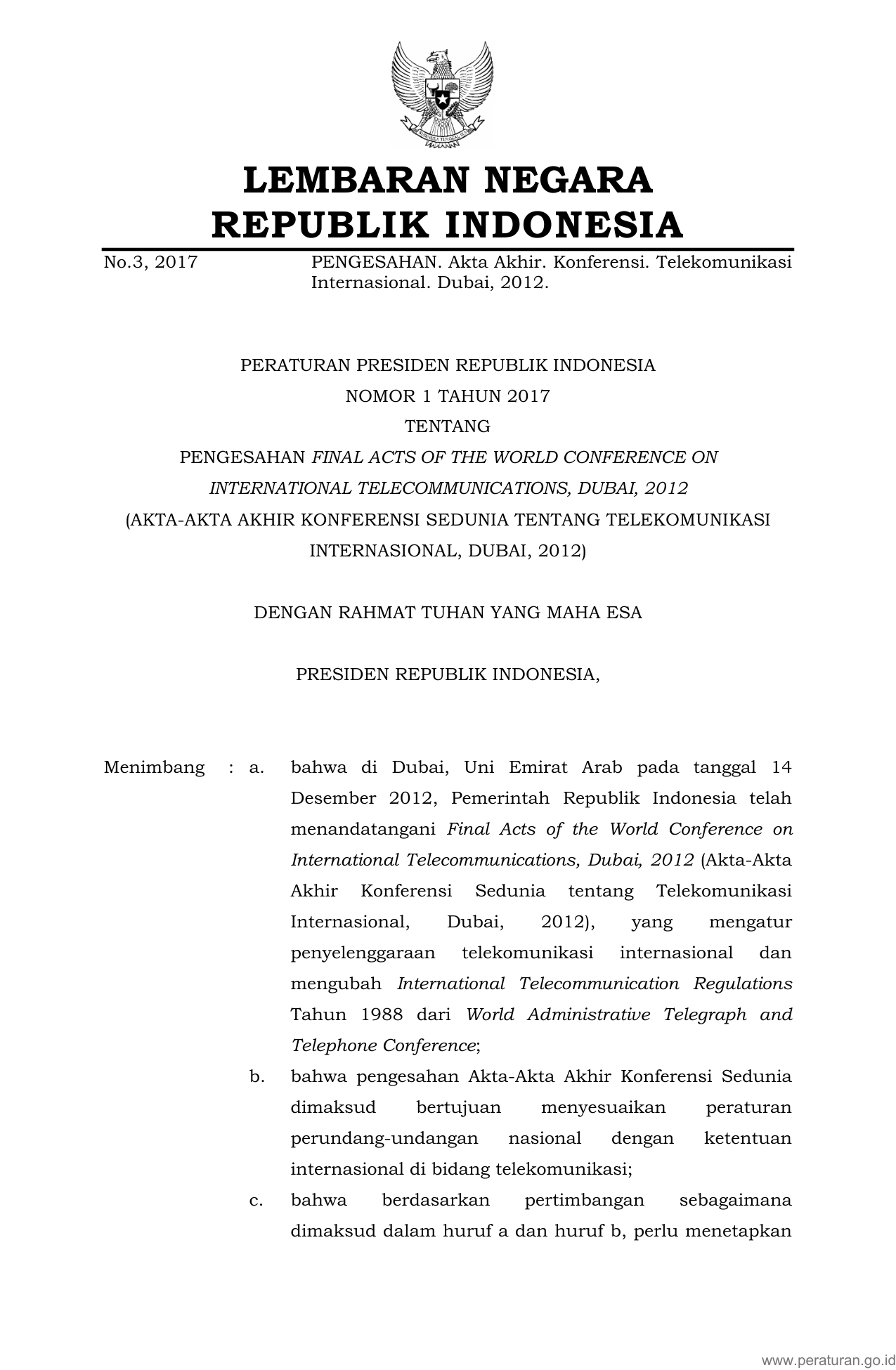 PERPRES Nomor 1 Tahun 2017 | Peraturan Presiden Nomor 1 Tahun 2017 tentang Pengesahan Final Acts Of The World Conference On International Telecommunications, Dubai, 2012 (Akta-Akta Akhir Konferensi Sedunia Tentang Telekomunikasi Internasional, Dubai, 2012)