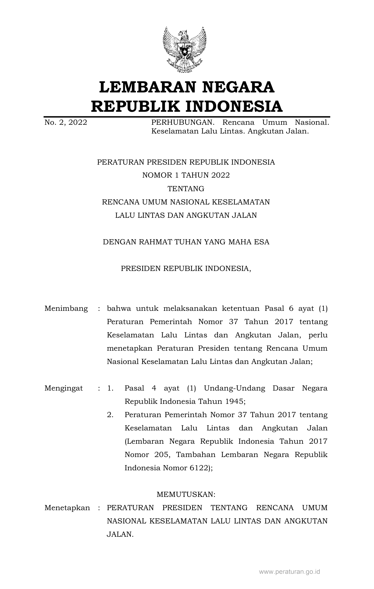 PERPRES Nomor 1 Tahun 2022 | Peraturan Presiden Nomor 1 Tahun 2022 tentang RENCANA UMUM NASIONAL KESELAMATAN LALU LINTAS DAN ANGKUTAN JALAN