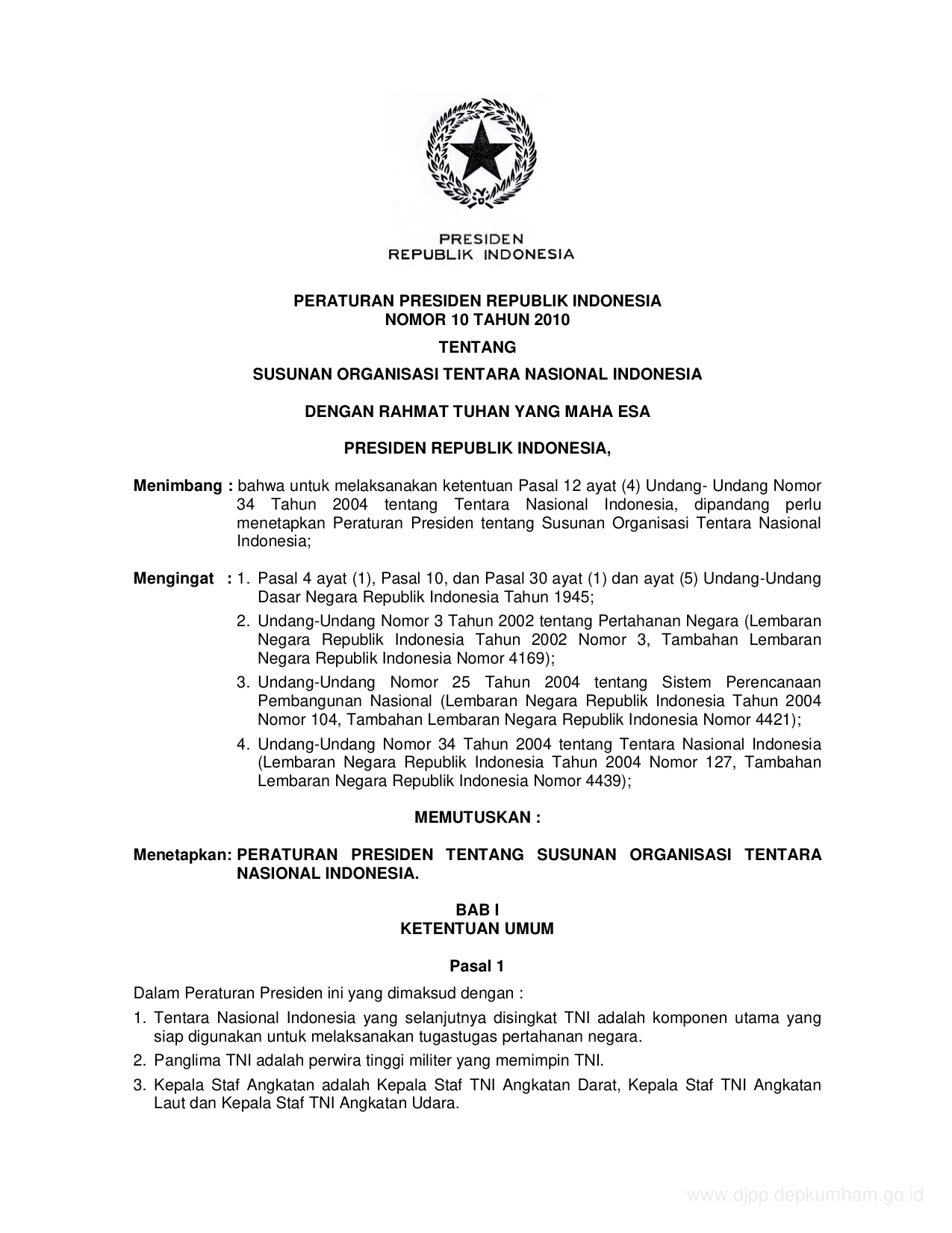 PERPRES Nomor 10 Tahun 2010 | Peraturan Presiden Nomor 10 Tahun 2010 tentang SUSUNAN ORGANISASI TENTARA NASIONAL INDONESIA