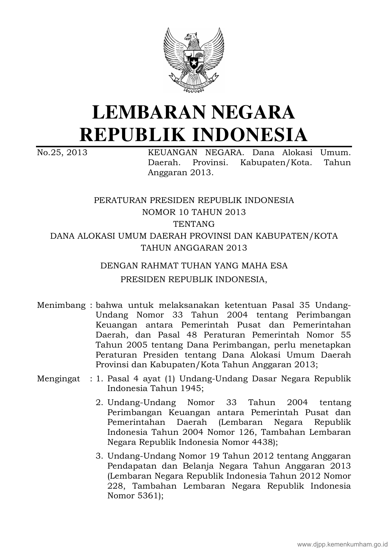 PERPRES Nomor 10 Tahun 2013 | Peraturan Presiden Nomor 10 Tahun 2013 tentang DANA ALOKASI UMUM DAERAH PROVINSI DAN KABUPATEN/KOTA TAHUN ANGGARAN 2013
