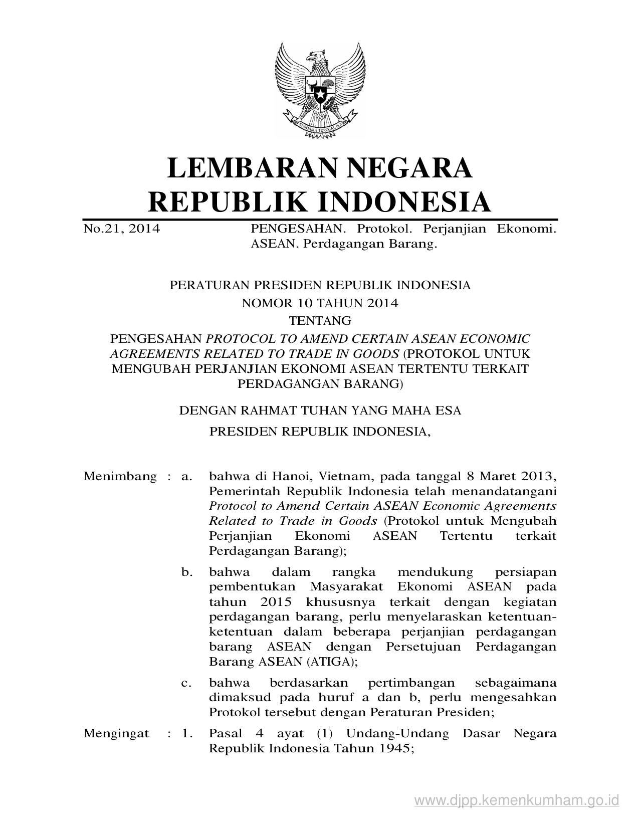 PERPRES Nomor 10 Tahun 2014 | Peraturan Presiden Nomor 10 Tahun 2014 tentang PENGESAHAN PROTOCOL TO AMEND CERTAIN ASEAN ECONOMIC AGREEMENTS RELATED TO TRADE IN GOODS (PROTOKOL UNTUK MENGUBAH PERJANJIAN EKONOMI ASEAN TERTENTU TERKAIT PERDAGANGAN BARANG)