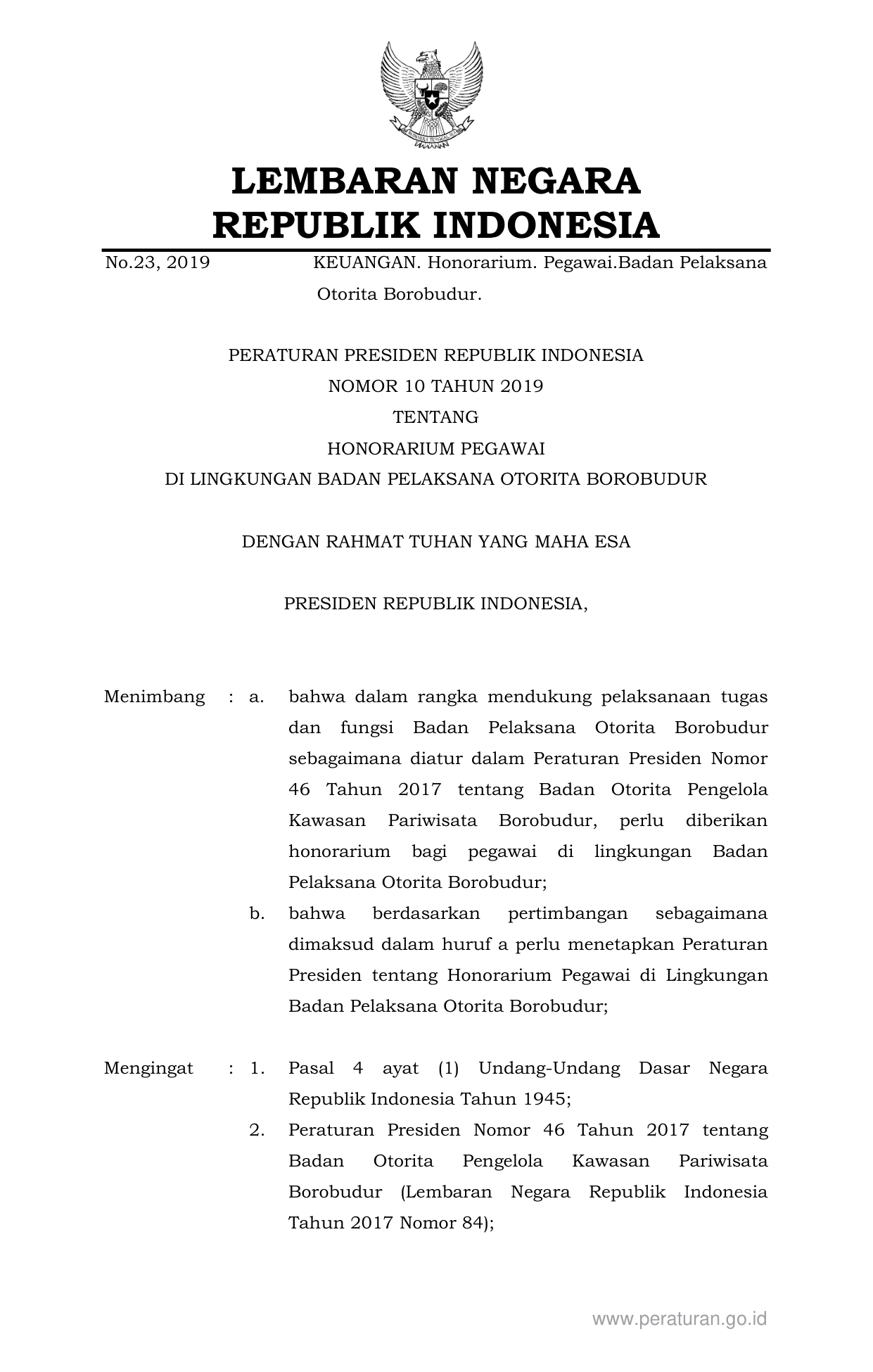 PERPRES Nomor 10 Tahun 2019 | Peraturan Presiden Nomor 10 Tahun 2019 tentang HONORARIUM PEGAWAI DI LINGKUNGAN BADAN PELAKSANA OTORITA BOROBUDUR