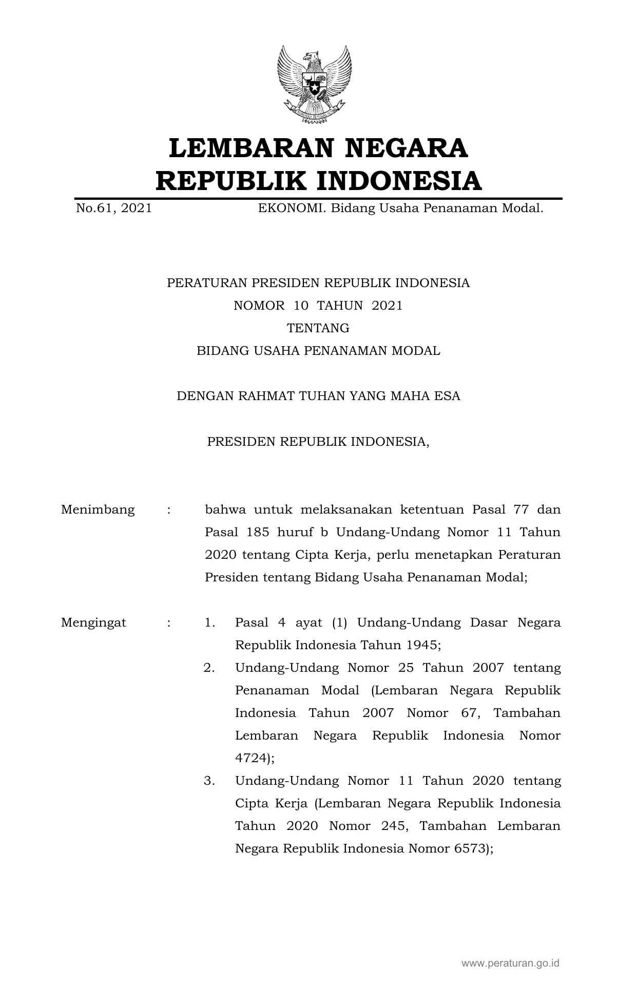 PERPRES Nomor 10 Tahun 2021 | Peraturan Presiden Nomor 10 Tahun 2021 tentang BIDANG USAHA PENANAMAN MODAL