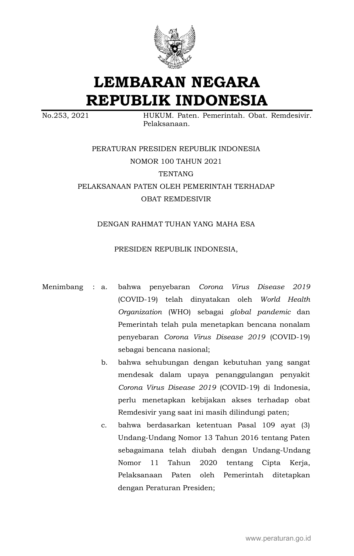 PERPRES Nomor 100 Tahun 2021 | Peraturan Presiden Nomor 100 Tahun 2021 tentang PELAKSANAAN PATEN OLEH PEMERINTAH TERHADAP OBAT REMDESIVIR