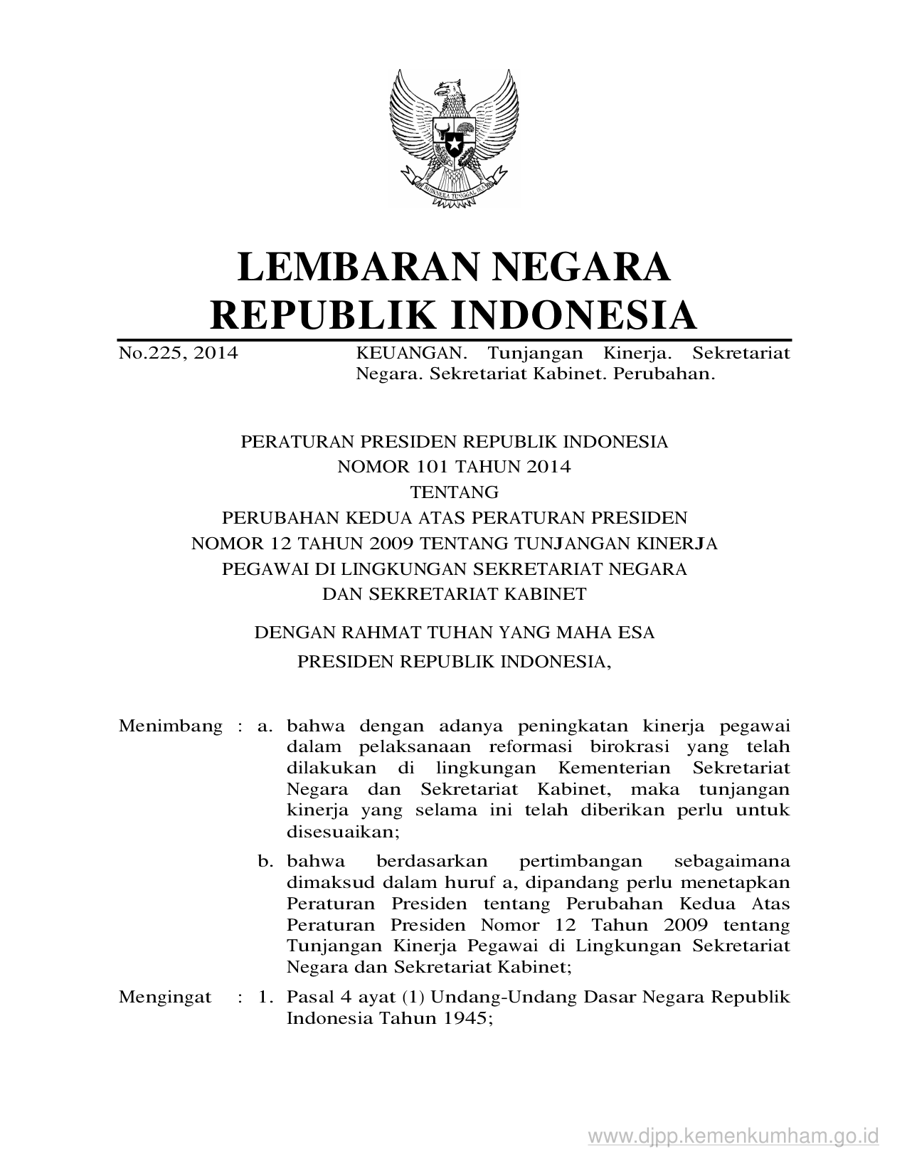 PERPRES Nomor 101 Tahun 2014 | Peraturan Presiden Nomor 101 Tahun 2014 tentang PERUBAHAN KEDUA ATAS PERATURAN PRESIDENNOMOR 12 TAHUN 2009 TENTANG TUNJANGAN KINERJAPEGAWAI DI LINGKUNGAN SEKRETARIAT NEGARADAN SEKRETARIAT KABINET