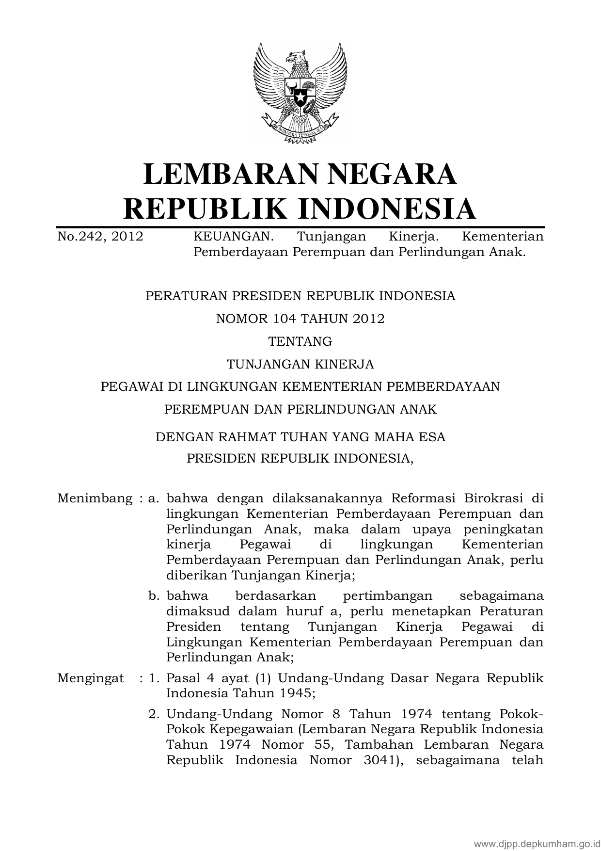 PERPRES Nomor 104 Tahun 2012 | Peraturan Presiden Nomor 104 Tahun 2012 tentang TUNJANGAN KINERJA PEGAWAI DI LINGKUNGAN KEMENTERIAN PEMBERDAYAAN PEREMPUAN DAN PERLINDUNGAN ANAK