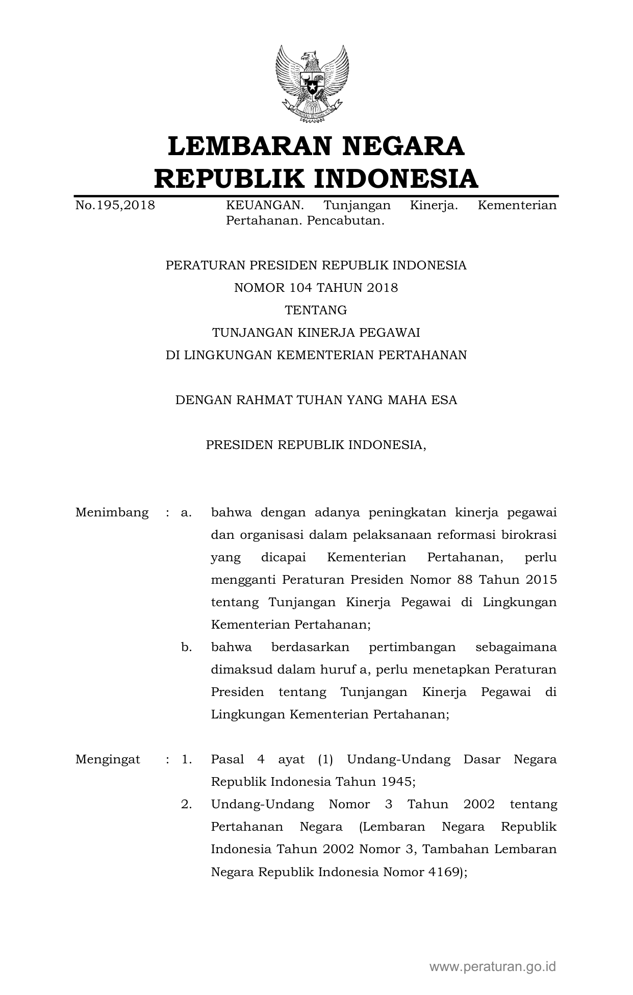 PERPRES Nomor 104 Tahun 2018 | Peraturan Presiden Nomor 104 Tahun 2018 tentang Tunjangan Kinerja Pegawai di Lingkungan Kementerian Pertahanan