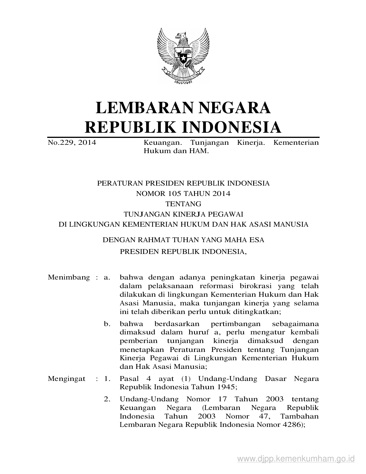 PERPRES Nomor 105 Tahun 2014 | Peraturan Presiden Nomor 105 Tahun 2014 tentang TUNJANGAN KINERJA PEGAWAIDI LINGKUNGAN KEMENTERIAN HUKUM DAN HAK ASASI MANUSIA