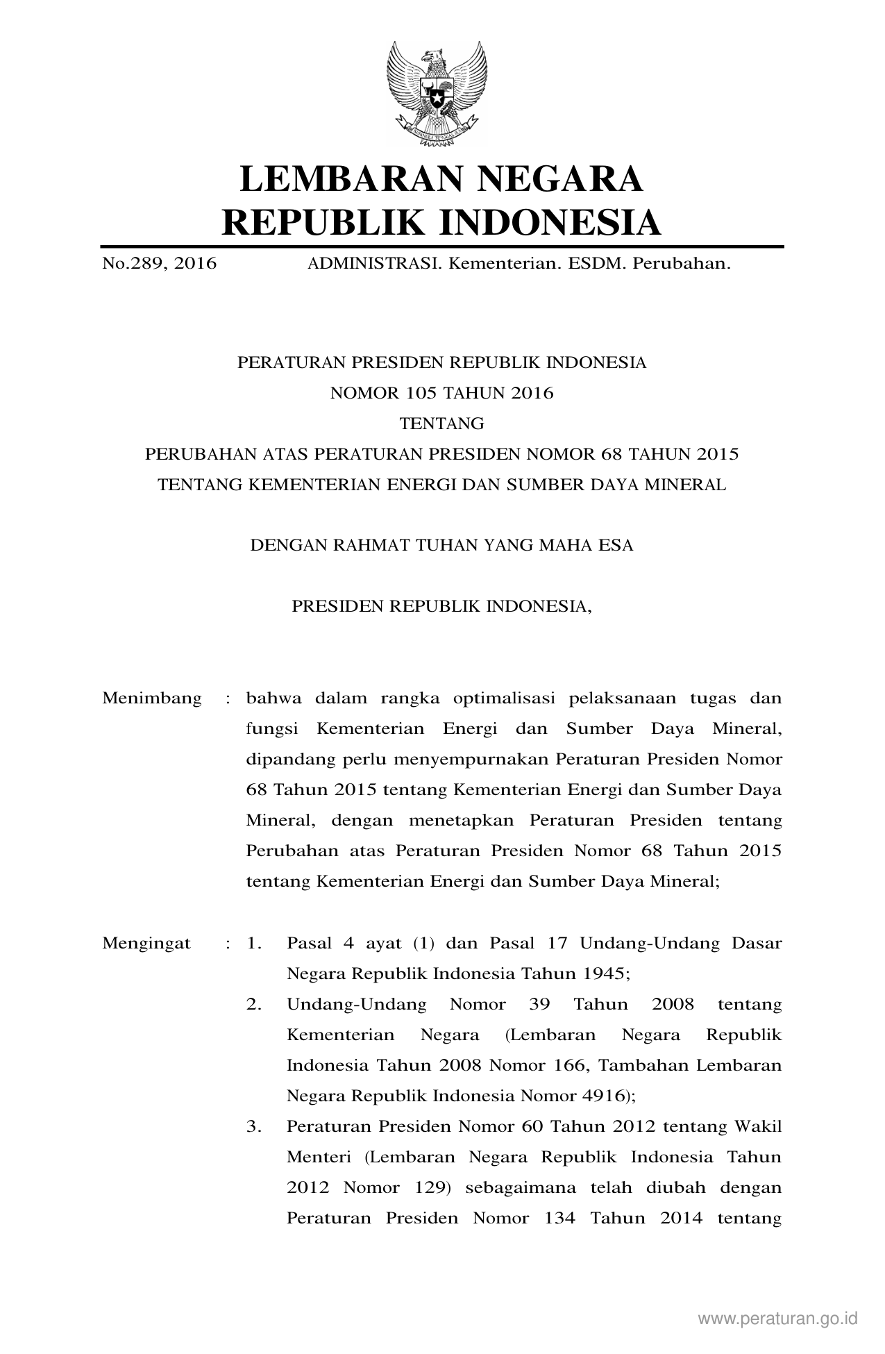 PERPRES Nomor 105 Tahun 2016 | Peraturan Presiden Nomor 105 Tahun 2016 tentang Perubahan Atas Peraturan Presiden Nomor 68 Tahun 2015 Tentang Kementerian Energi Dan Sumber Daya Mineral