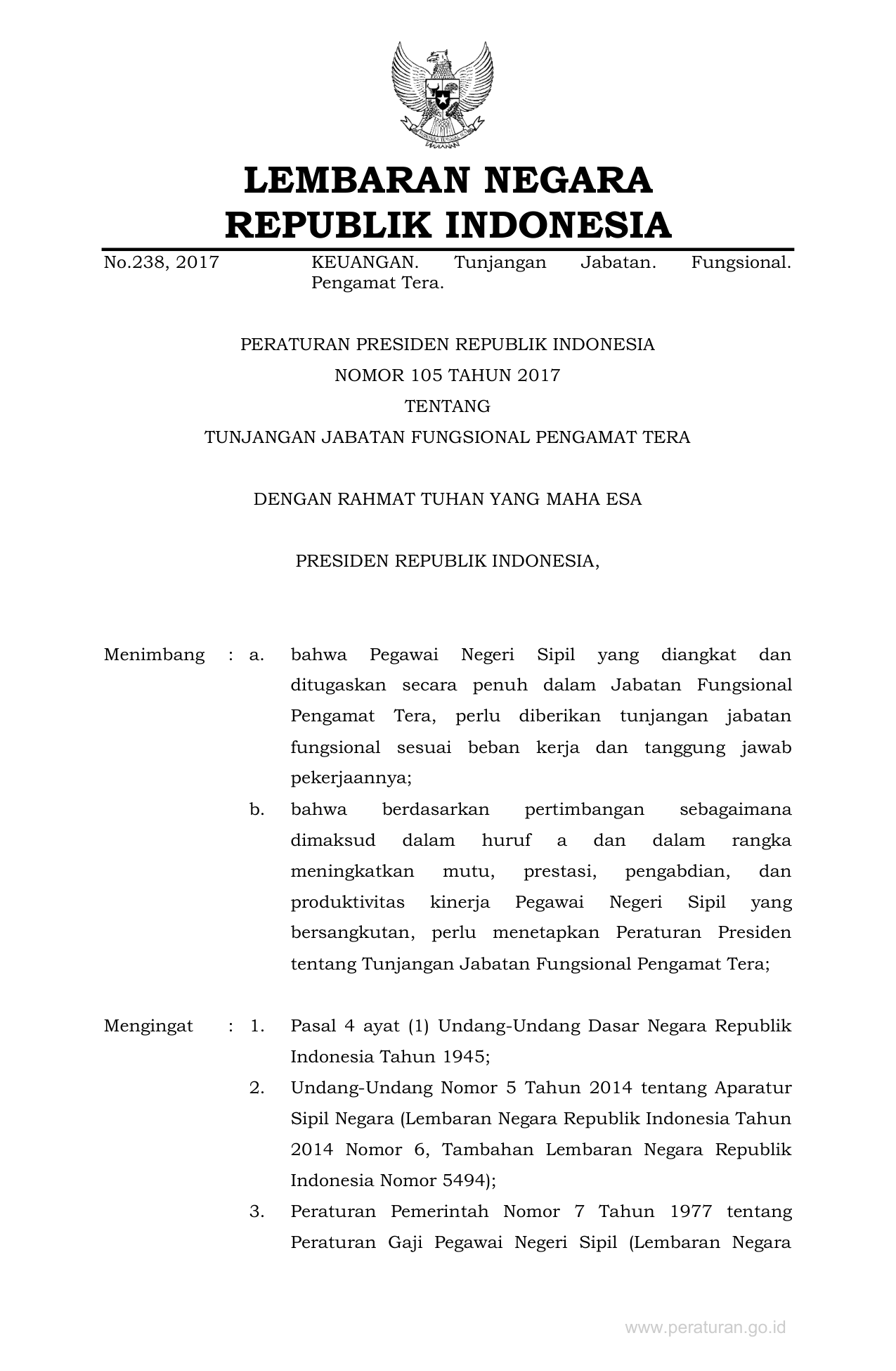 PERPRES Nomor 105 Tahun 2017 | Peraturan Presiden Nomor 105 Tahun 2017 tentang Tunjangan Jabatan Fungsional Pengamat Tera