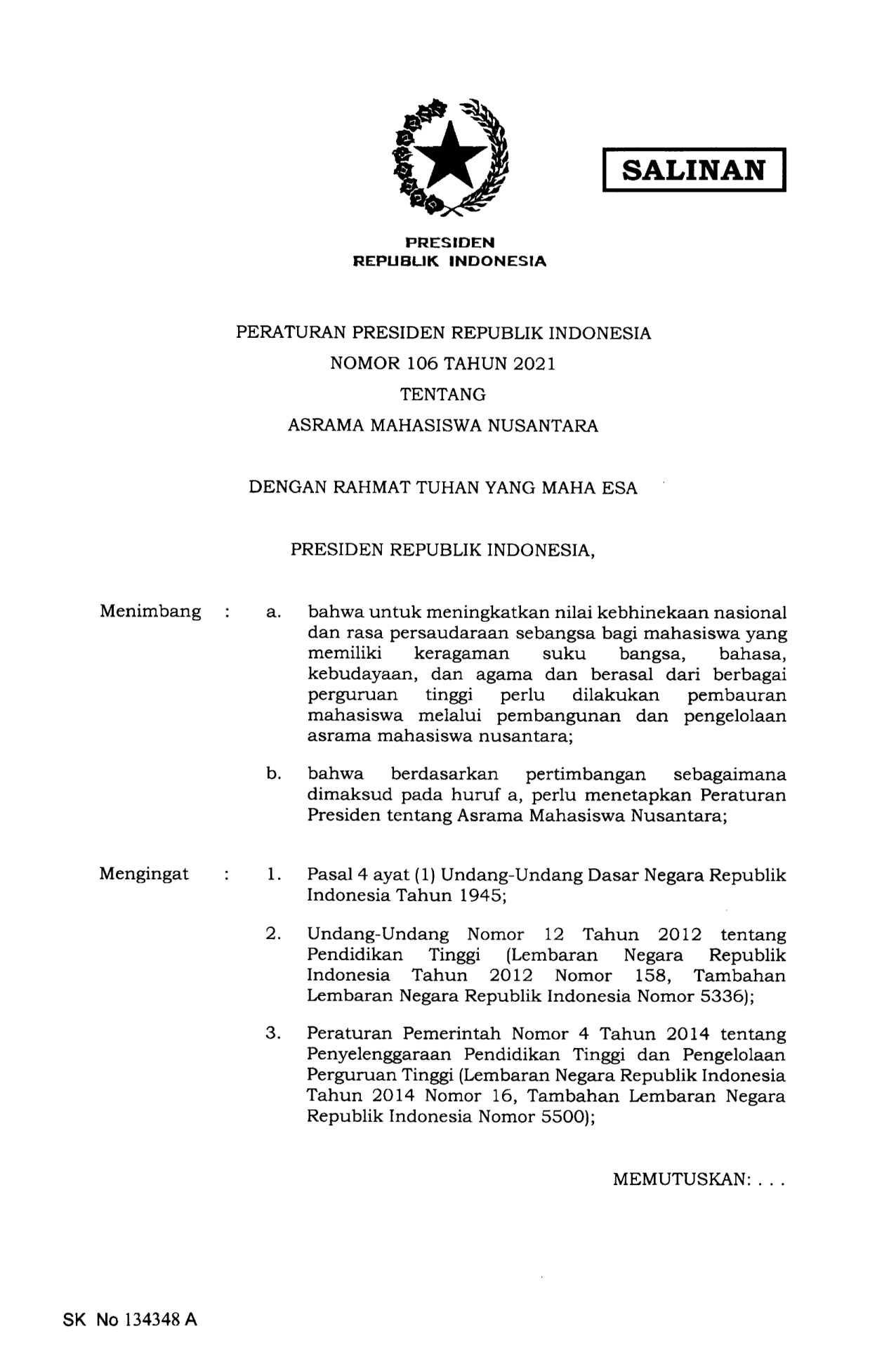 PERPRES Nomor 106 Tahun 2021 | Peraturan Presiden Nomor 106 Tahun 2021 tentang ASRAMA MAHASISWA NUSANTARA