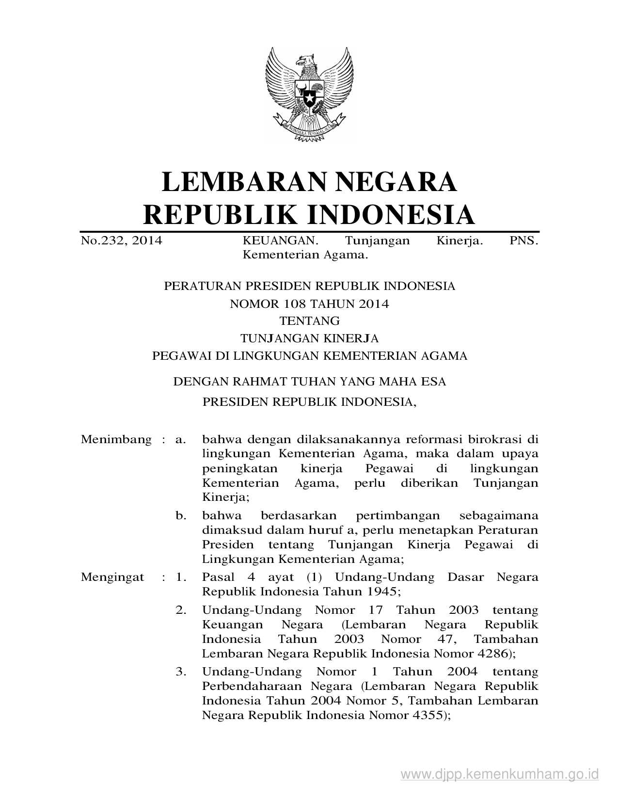 PERPRES Nomor 108 Tahun 2014 | Peraturan Presiden Nomor 108 Tahun 2014 tentang TUNJANGAN KINERJAPEGAWAI DI LINGKUNGAN KEMENTERIAN AGAMA