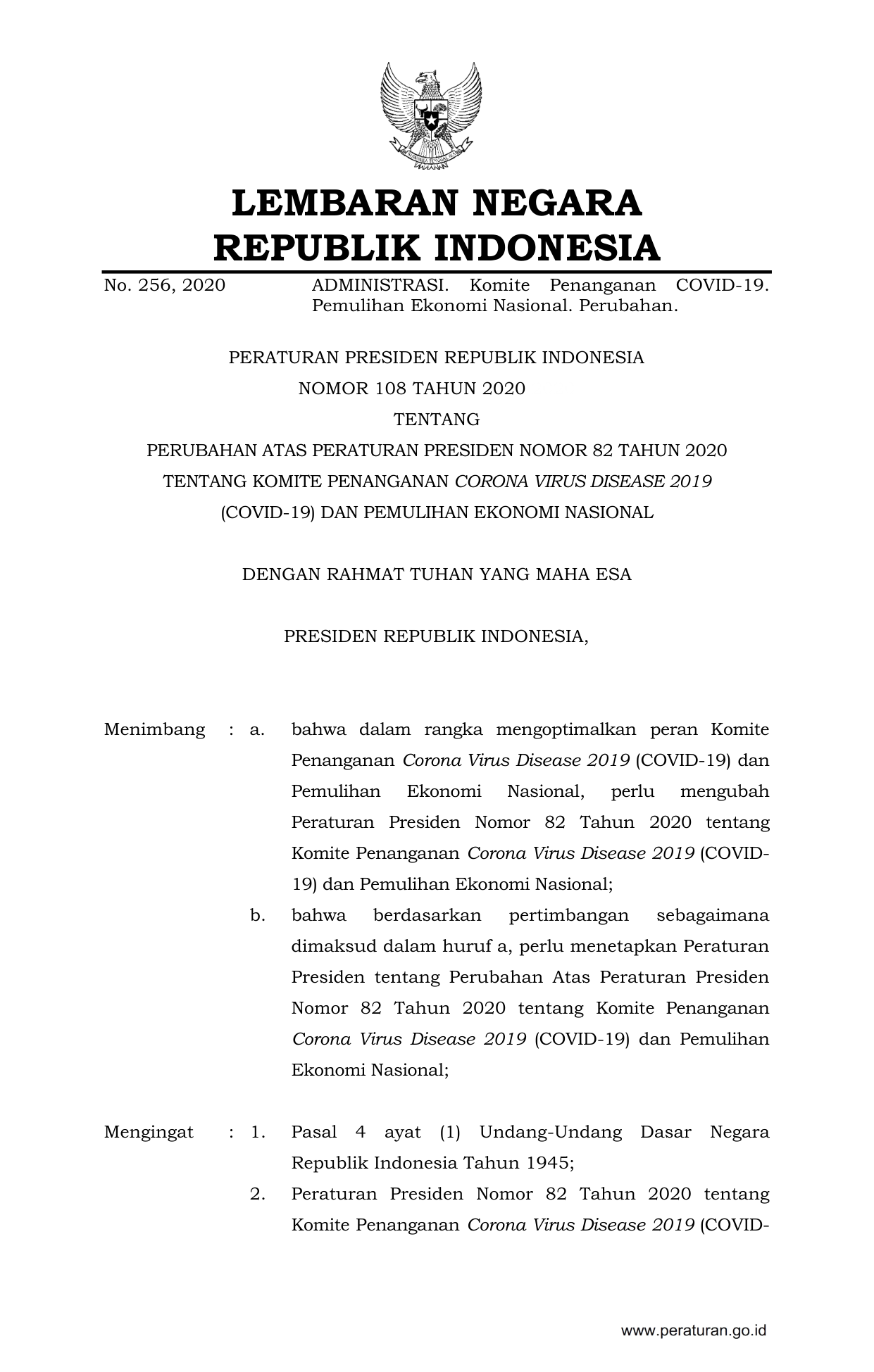 PERPRES Nomor 108 Tahun 2020 | Peraturan Presiden Nomor 108 Tahun 2020 tentang PERUBAHAN ATAS PERATURAN PRESIDEN NOMOR 82 TAHUN 2020 TENTANG KOMITE PENANGANAN CORONA VIRUS DISEASE 2019 (COVID-19) DAN PEMULIHAN EKONOMI NASIONAL
