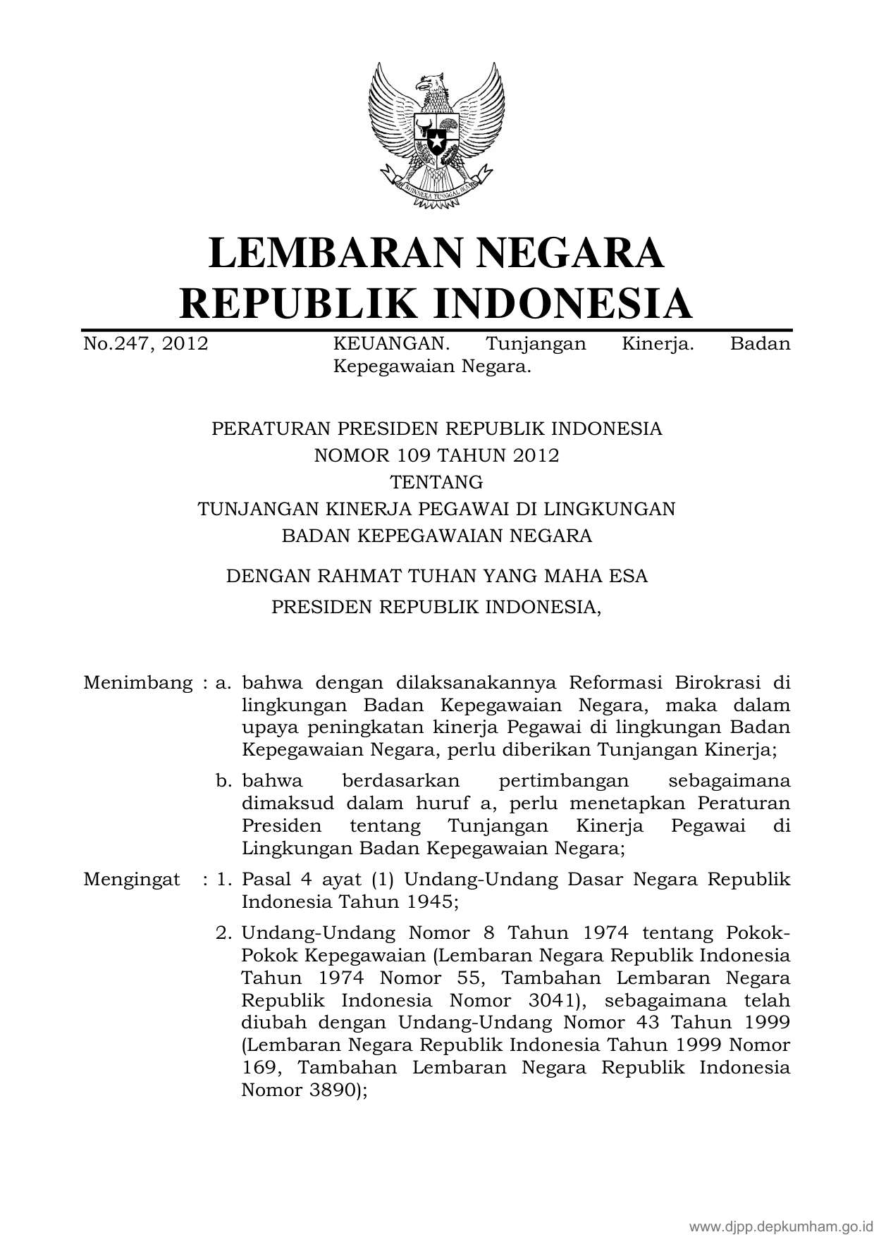 PERPRES Nomor 109 Tahun 2012 | Peraturan Presiden Nomor 109 Tahun 2012 tentang TUNJANGAN KINERJA PEGAWAI DI LINGKUNGAN BADAN KEPEGAWAIAN NEGARA