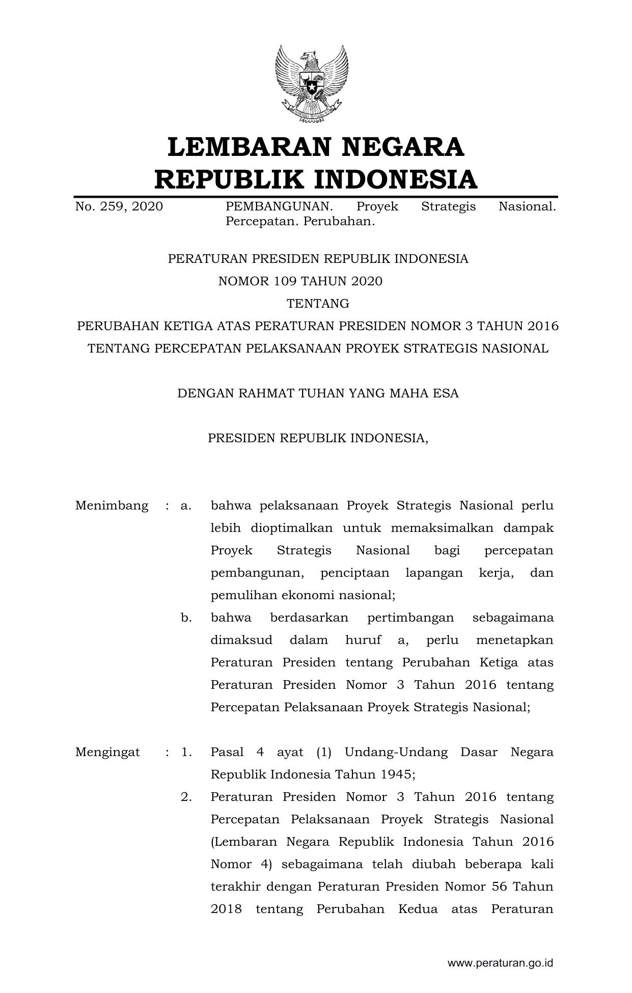 PERPRES Nomor 109 Tahun 2020 | Peraturan Presiden Nomor 109 Tahun 2020 tentang PERUBAHAN KETIGA ATAS PERATURAN PRESIDEN NOMOR 3 TAHUN 2016TENTANG PERCEPATAN PELAKSANAAN PROYEK STRATEGIS NASIONAL