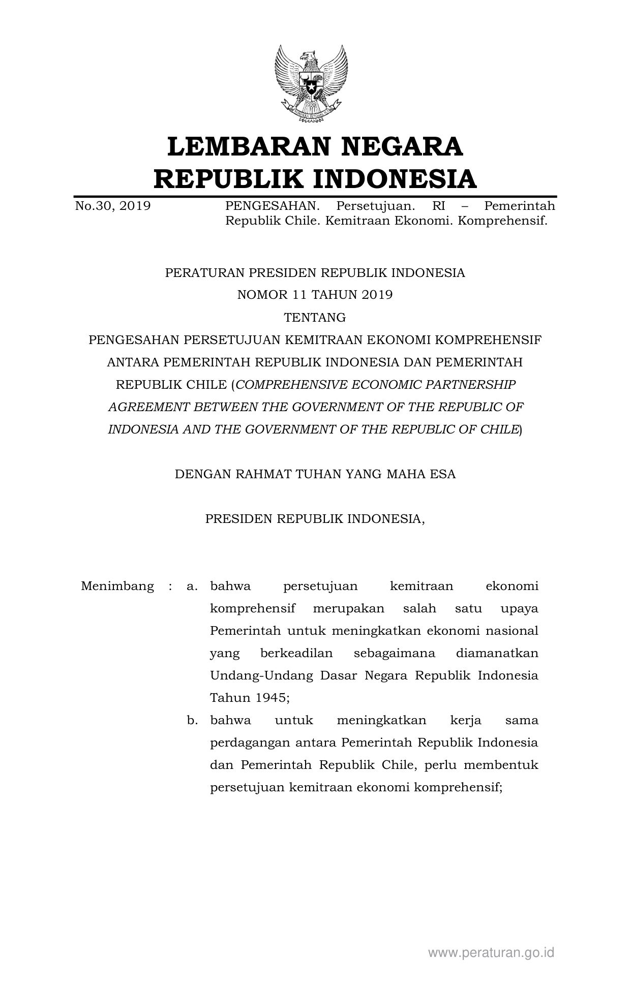 PERPRES Nomor 11 Tahun 2019 | Peraturan Presiden Nomor 11 Tahun 2019 tentang PENGESAHAN PERSETUJUAN KEMITRAAN EKONOMI KOMPREHENSIF ANTARA PEMERINTAH REPUBLIK INDONESIA DAN PEMERINTAH REPUBLIK CHILE (COMPREHENSIVE ECONOMIC PARTNERSHIP AGREEMENT BETWEEN THE GOVERNMENT OF THE REPUBLIC OF INDONESIA AND THE GOVERNMENT OF THE REPUBLIC OF CHILE)