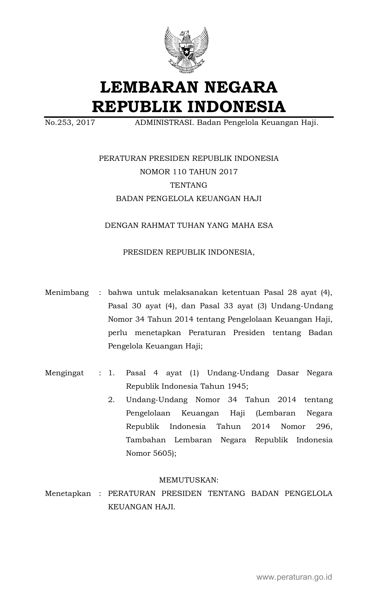 PERPRES Nomor 110 Tahun 2017 | Peraturan Presiden Nomor 110 Tahun 2017 tentang Badan Pengelola Keuangan Haji