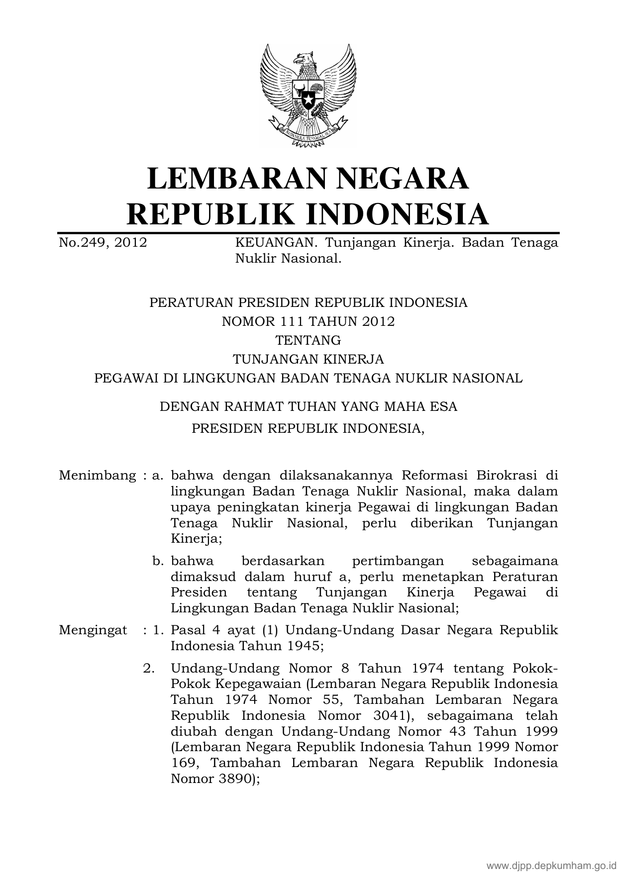 PERPRES Nomor 111 Tahun 2012 | Peraturan Presiden Nomor 111 Tahun 2012 tentang TUNJANGAN KINERJA PEGAWAI DI LINGKUNGAN BADAN TENAGA NUKLIR NASIONAL