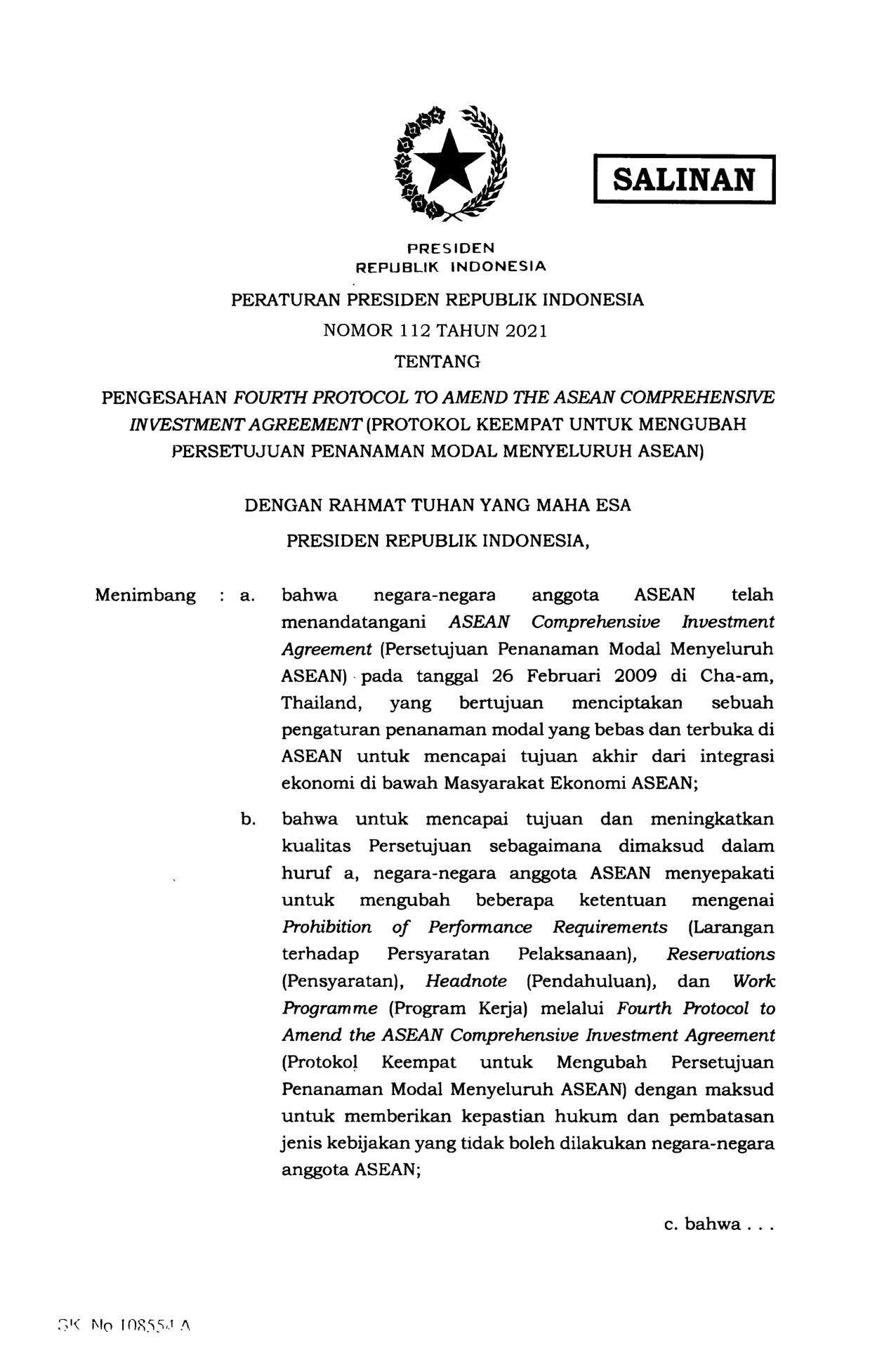 PERPRES Nomor 112 Tahun 2021 | Peraturan Presiden Nomor 112 Tahun 2021 tentang PENGESAHAN FOURTH PROTOCOL TO AMEND THE, ASEAN COMPREHENSIVE INVESTMENT AGREEMENT (PROTOKOL KEEMPAT UNTUK MENGUBAH PERSETUJUAN PENANAMAN MODAL MENYELURUH ASEAN)