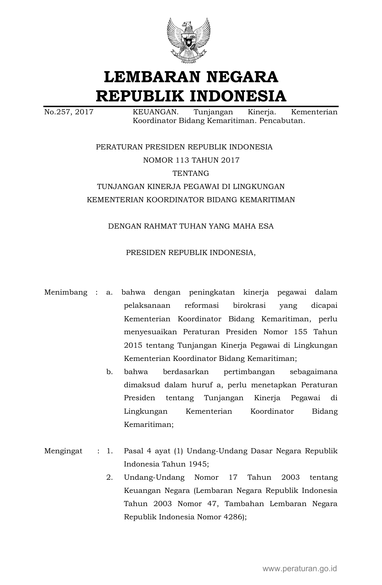 PERPRES Nomor 113 Tahun 2017 | Peraturan Presiden Nomor 113 Tahun 2017 tentang Tunjangan Kinerja Pegawai di Lingkungan Kementerian Koordinator Bidang Kemaritiman