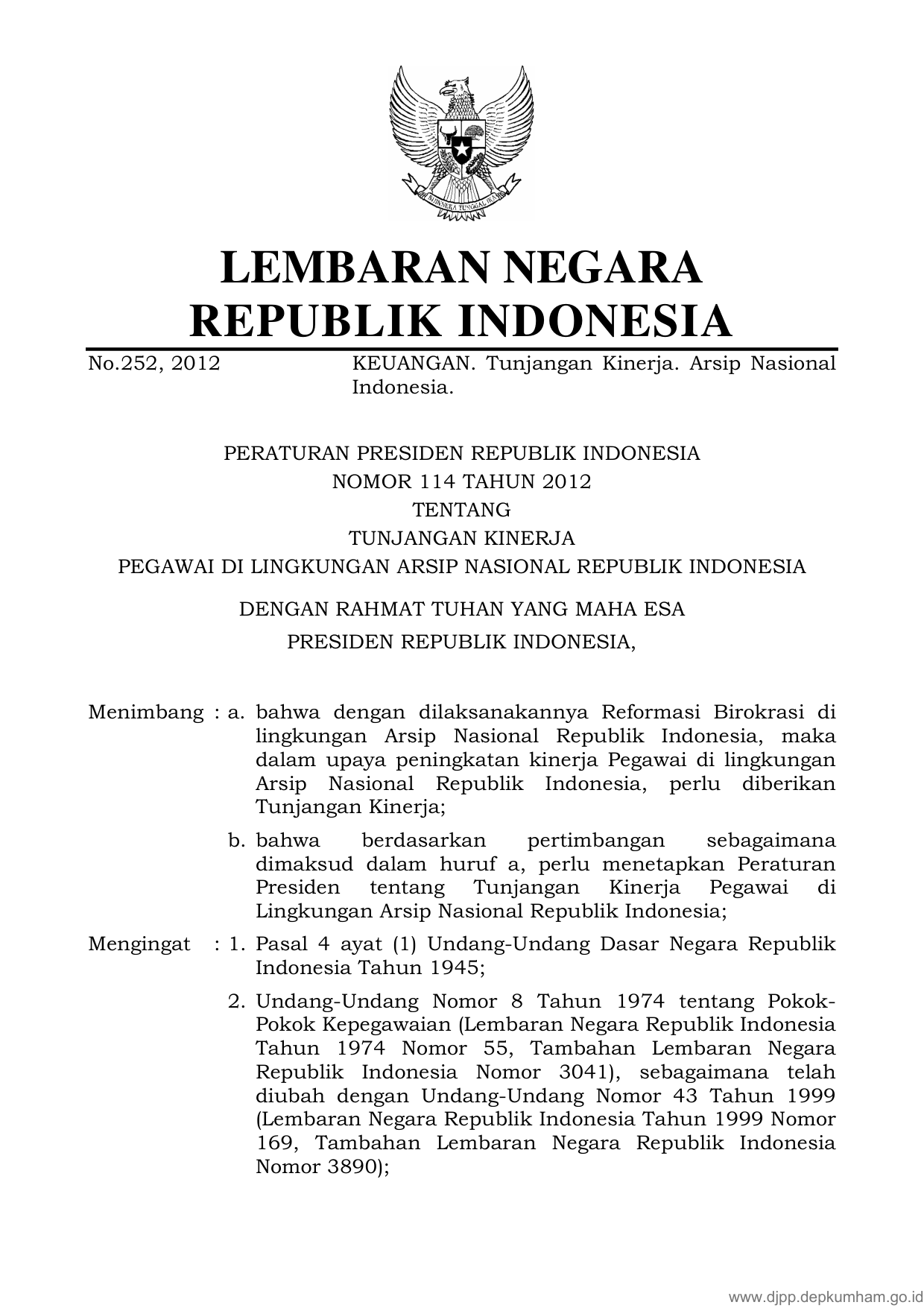PERPRES Nomor 114 Tahun 2012 | Peraturan Presiden Nomor 114 Tahun 2012 tentang TUNJANGAN KINERJA PEGAWAI DI LINGKUNGAN ARSIP NASIONAL REPUBLIK INDONESIA