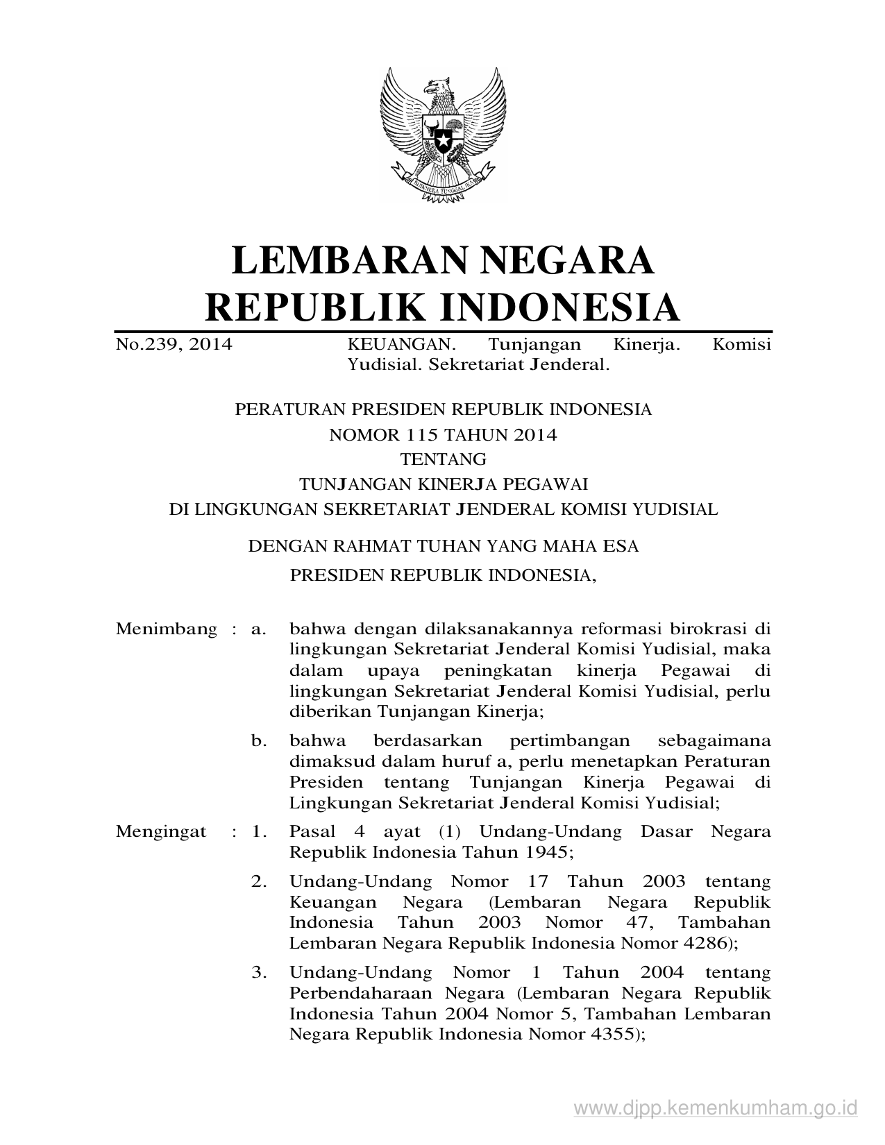 PERPRES Nomor 115 Tahun 2014 | Peraturan Presiden Nomor 115 Tahun 2014 tentang TUNJANGAN KINERJA PEGAWAIDI LINGKUNGAN SEKRETARIAT JENDERAL KOMISI YUDISIAL