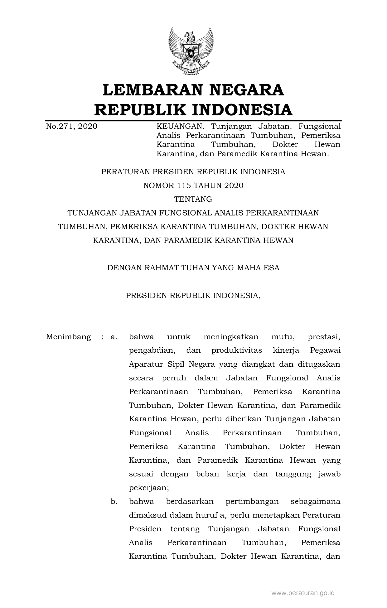 PERPRES Nomor 115 Tahun 2020 | Peraturan Presiden Nomor 115 Tahun 2020 tentang TUNJANGAN JABATAN FUNGSIONAL ANALIS PERKARANTINAAN TUMBUHAN, PEMERIKSA KARANTINA TUMBUHAN, DOKTER HEWAN KARANTINA, DAN PARAMEDIK KARANTINA HEWAN