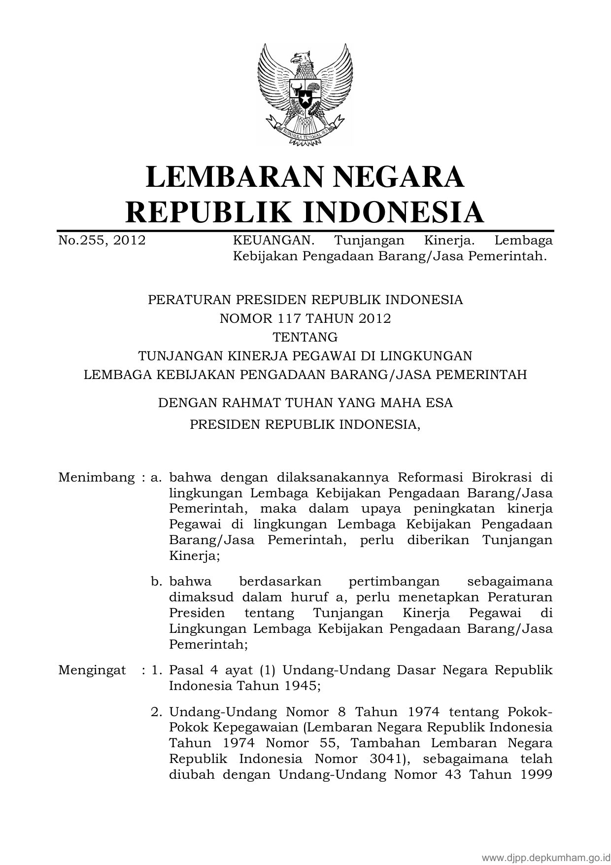 PERPRES Nomor 117 Tahun 2012 | Peraturan Presiden Nomor 117 Tahun 2012 tentang TUNJANGAN KINERJA PEGAWAI DI LINGKUNGAN LEMBAGA KEBIJAKAN PENGADAAN BARANG/JASA PEMERINTAH