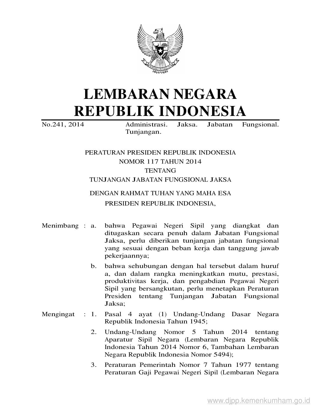 PERPRES Nomor 117 Tahun 2014 | Peraturan Presiden Nomor 117 Tahun 2014 tentang TUNJANGAN JABATAN FUNGSIONAL JAKSA