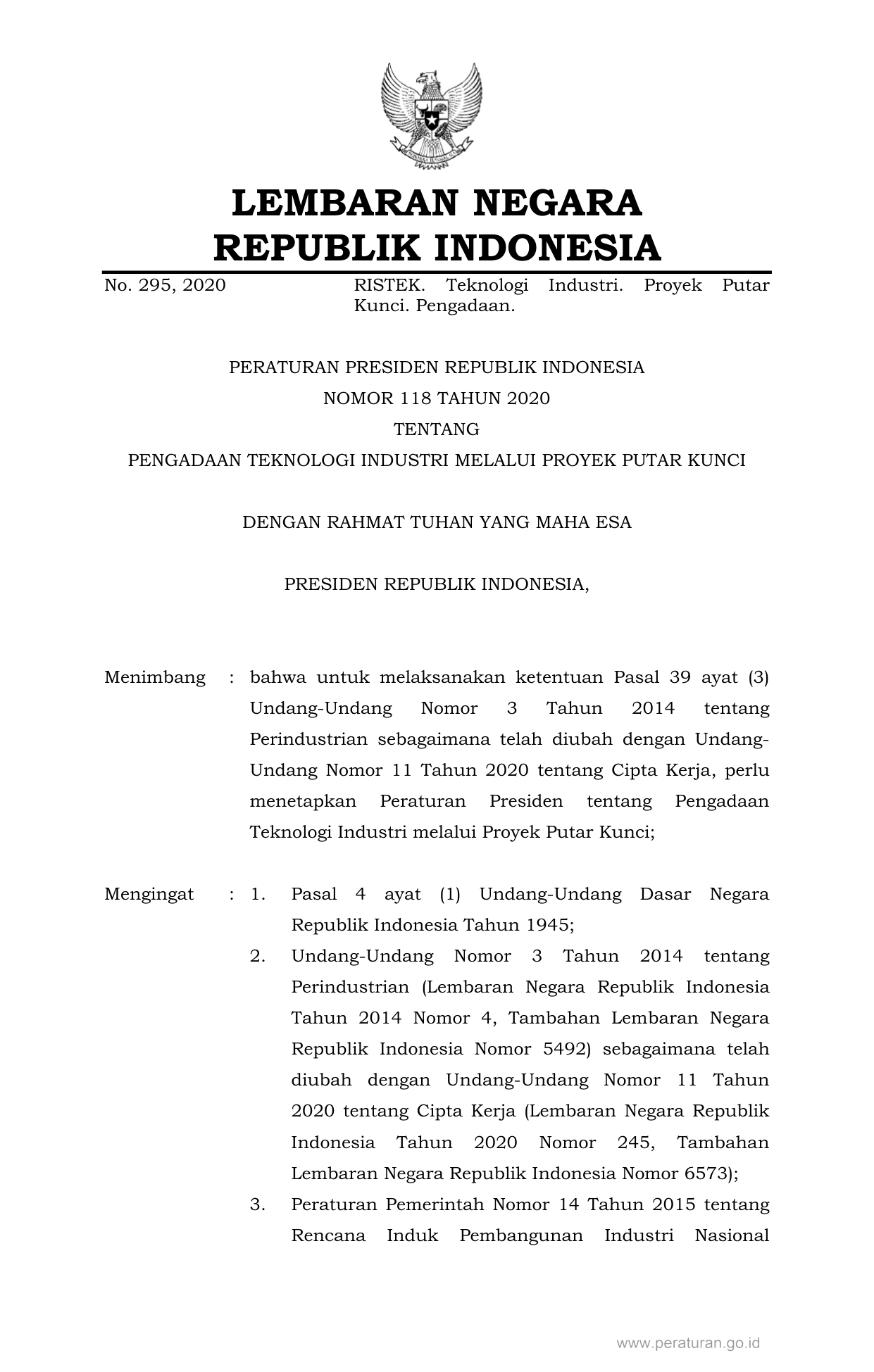 PERPRES Nomor 118 Tahun 2020 | Peraturan Presiden Nomor 118 Tahun 2020 tentang PENGADAAN TEKNOLOGI INDUSTRI MELALUI PROYEK PUTAR KUNCI