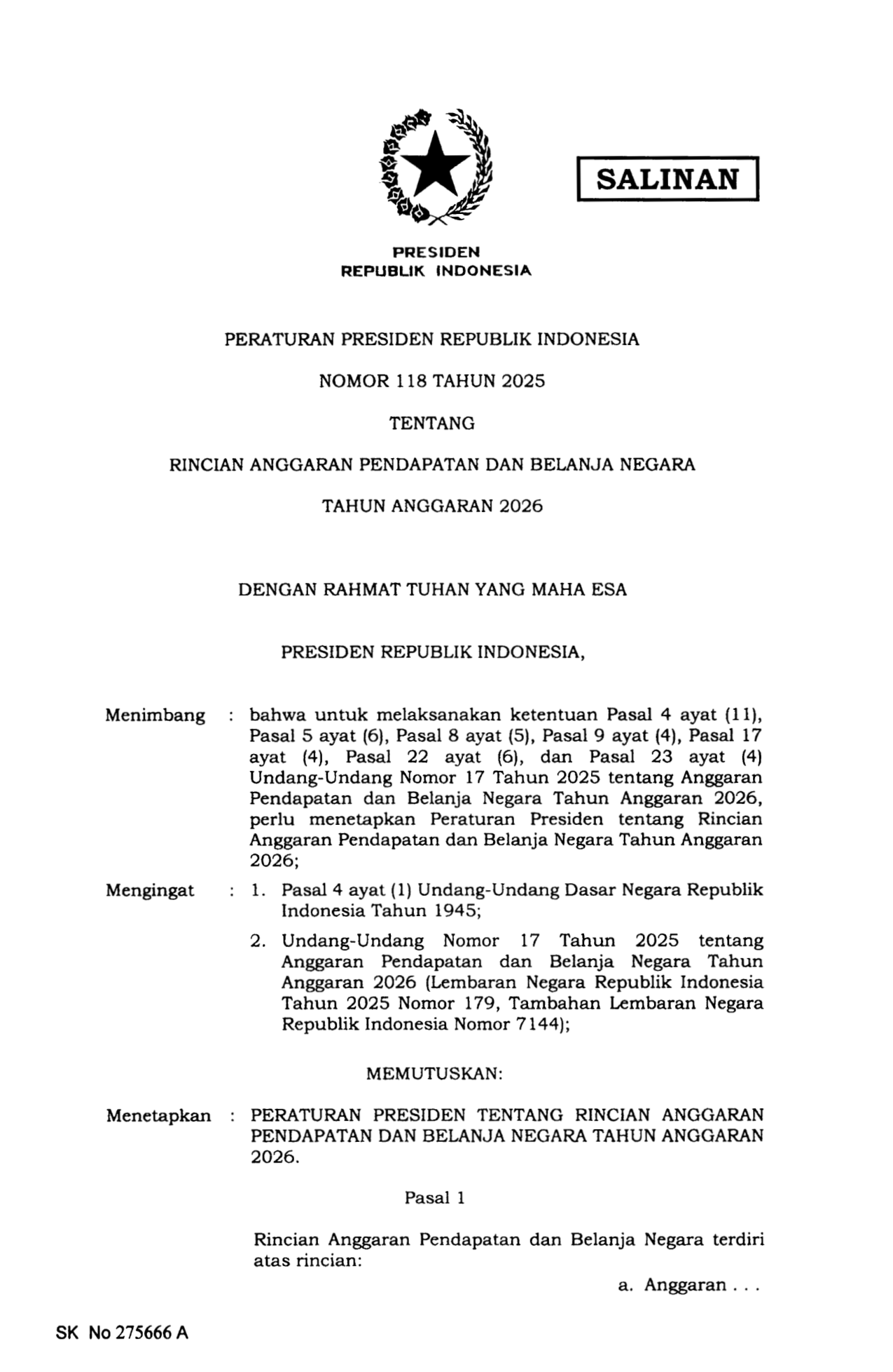 PERPRES Nomor 118 Tahun 2025 | Peraturan Presiden Nomor 118 Tahun 2025 tentang Rincian Anggaran Pendapatan Dan Belanja Negara Tahun Anggaran 2026
