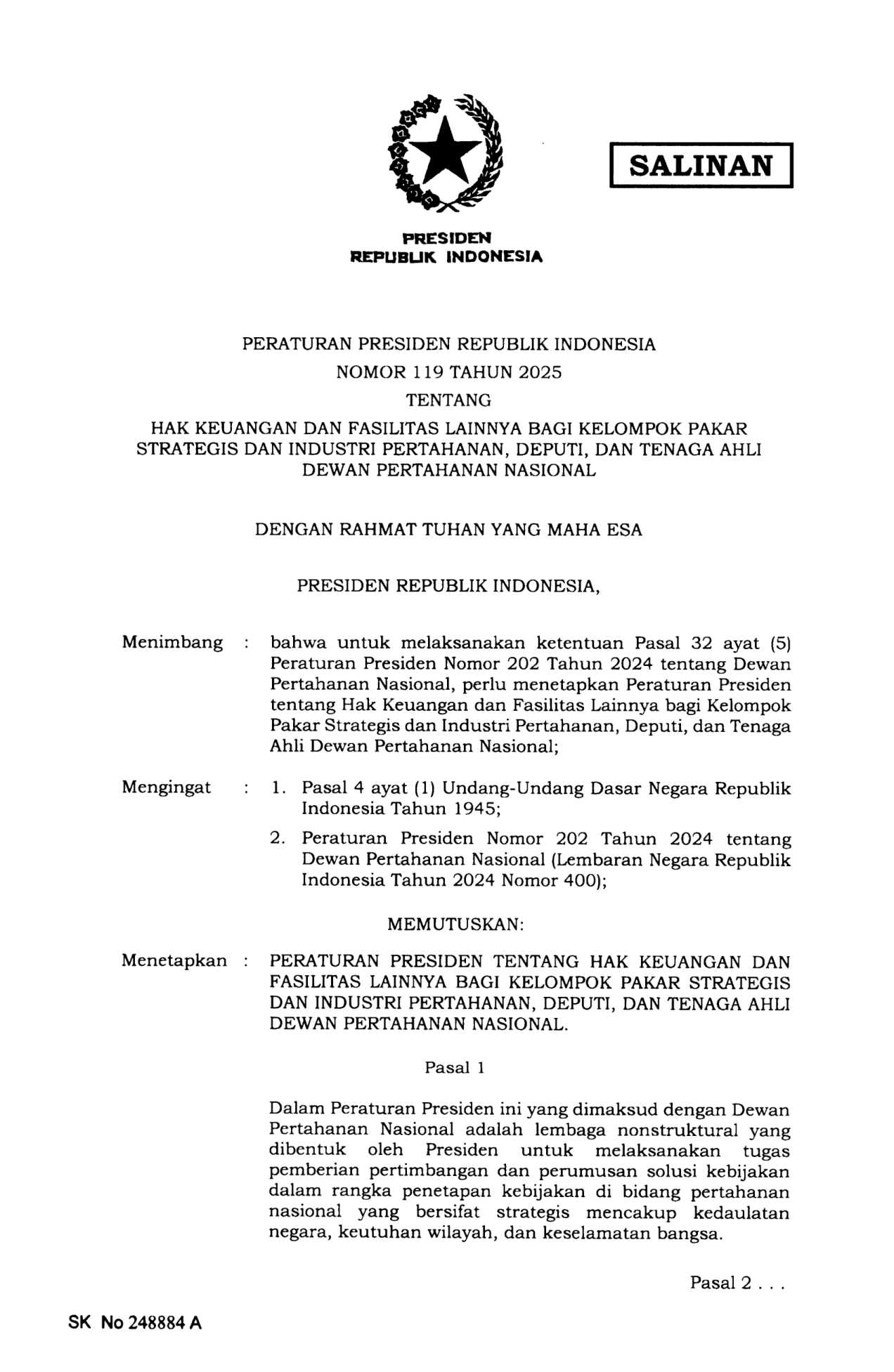 PERPRES Nomor 119 Tahun 2025 | Peraturan Presiden Nomor 119 Tahun 2025 tentang Hak Keuangan dan Fasilitas Lainnya bagi Kelompok Pakar Strategis dan Industri Pertahanan, Deputi, dan Tenaga Ahli Dewan Pertahanan Nasional