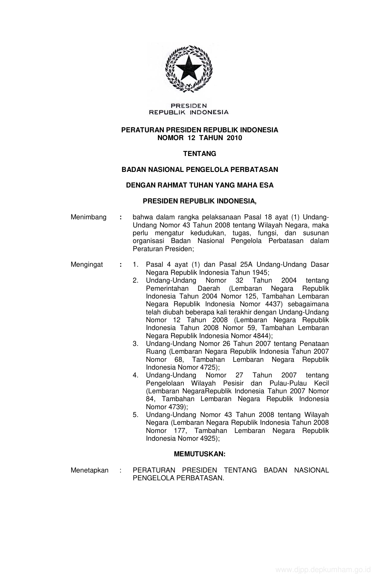 PERPRES Nomor 12 Tahun 2010 | Peraturan Presiden Nomor 12 Tahun 2010 tentang BADAN NASIONAL PENGELOLA PERBATASAN