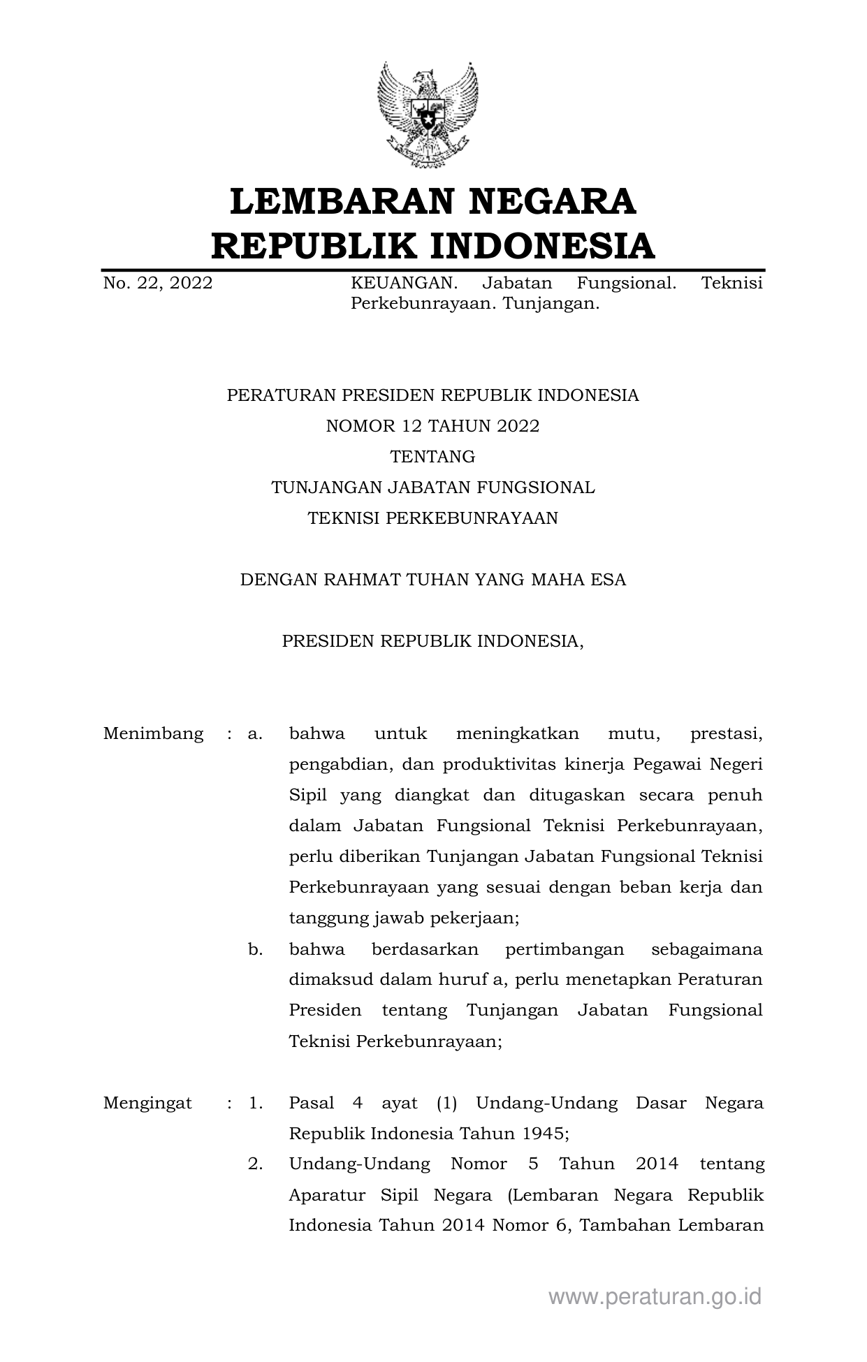 PERPRES Nomor 12 Tahun 2022 | Peraturan Presiden Nomor 12 Tahun 2022 tentang TUNJANGAN JABATAN FUNGSIONAL TEKNISI PERKEBUNRAYAAN