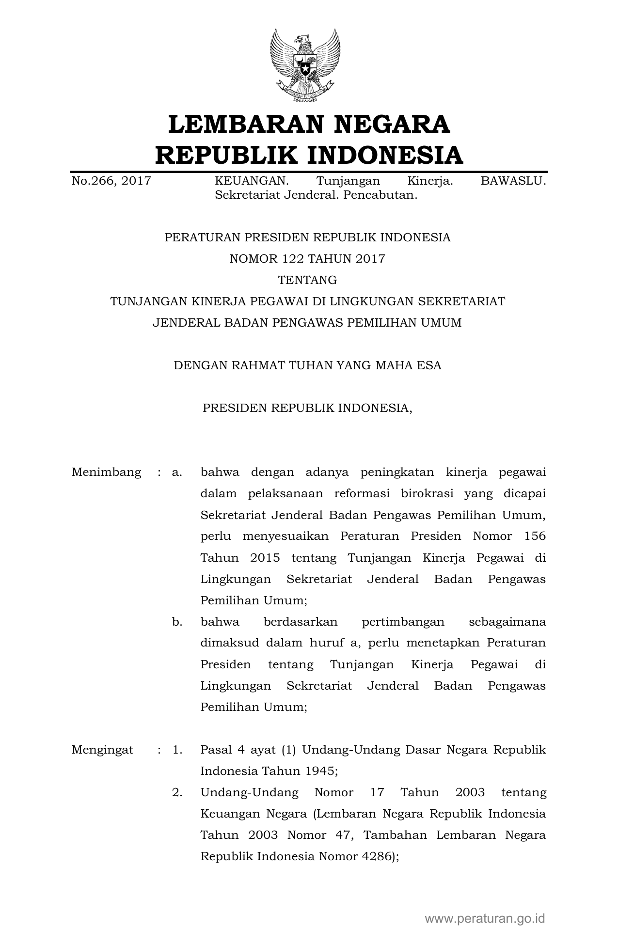 PERPRES Nomor 122 Tahun 2017 | Peraturan Presiden Nomor 122 Tahun 2017 tentang Tunjangan Kinerja Pegawai di Lingkungan Sekretariat Jenderal Badan Pengawas Pemilihan Umum