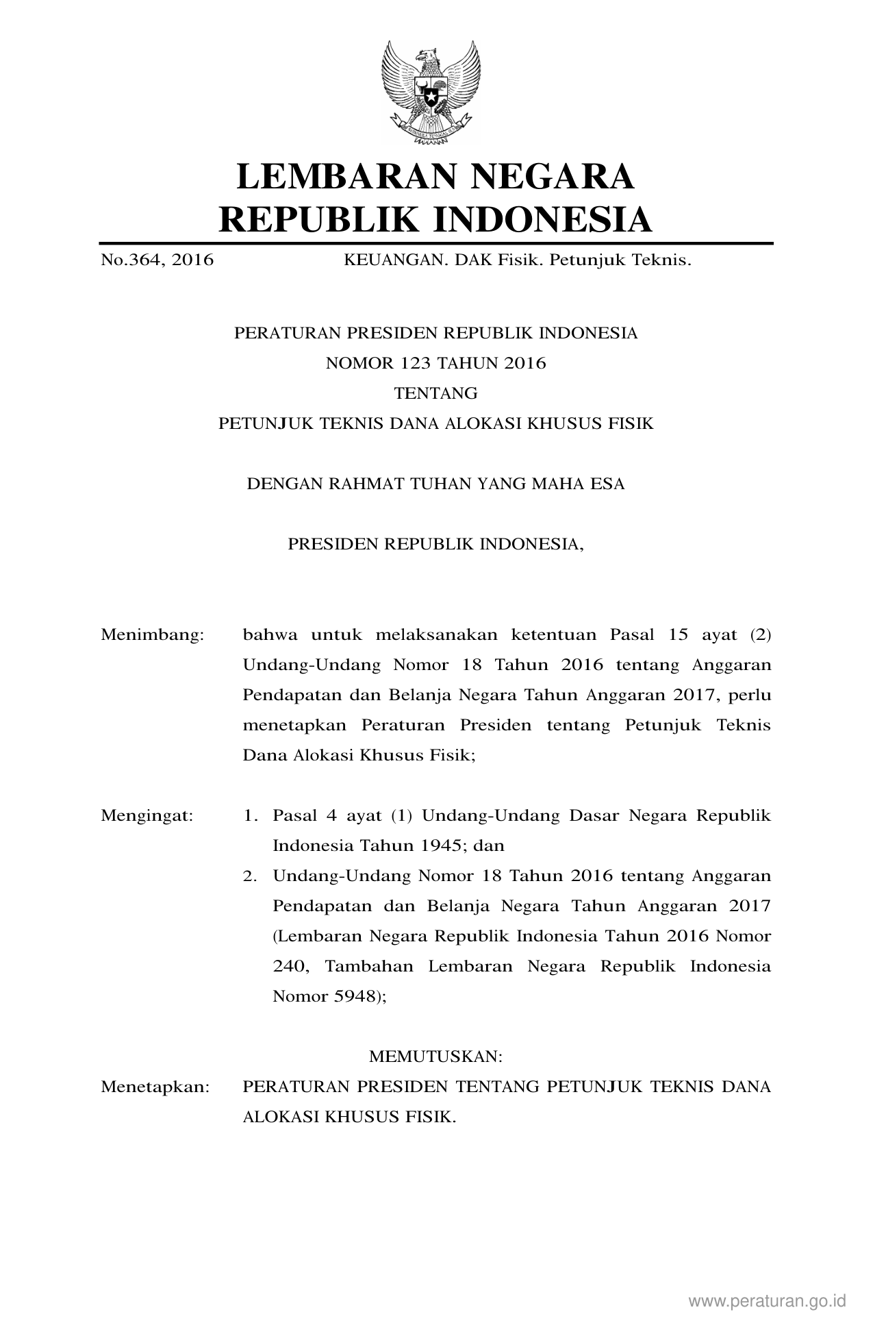 PERPRES Nomor 123 Tahun 2016 | Peraturan Presiden Nomor 123 Tahun 2016 tentang Petunjuk Teknis Dana Alokasi Khusus Fisik