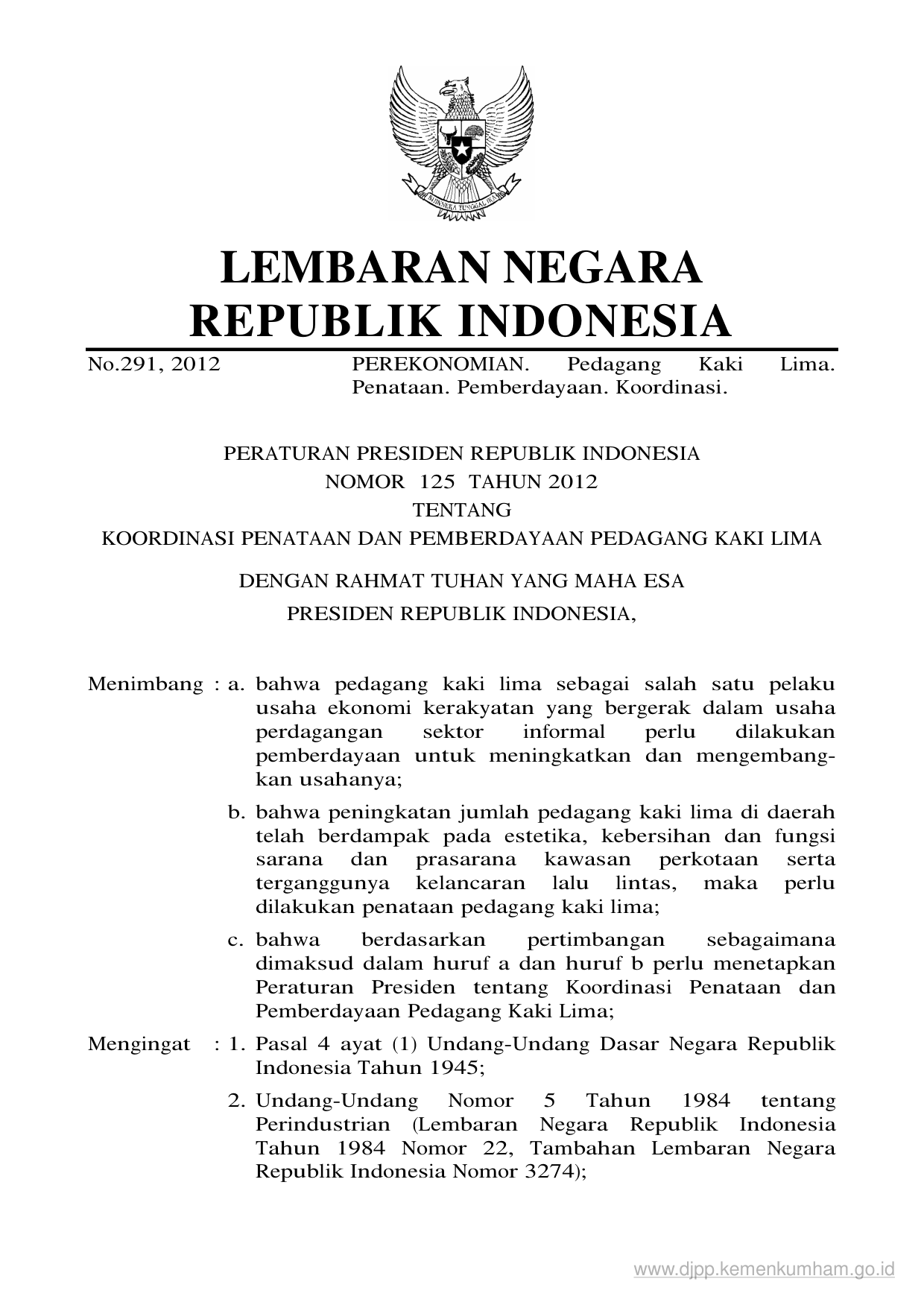 PERPRES Nomor 125 Tahun 2012 | Peraturan Presiden Nomor 125 Tahun 2012 tentang KOORDINASI PENATAAN DAN PEMBERDAYAAN PEDAGANG KAKI LIMA