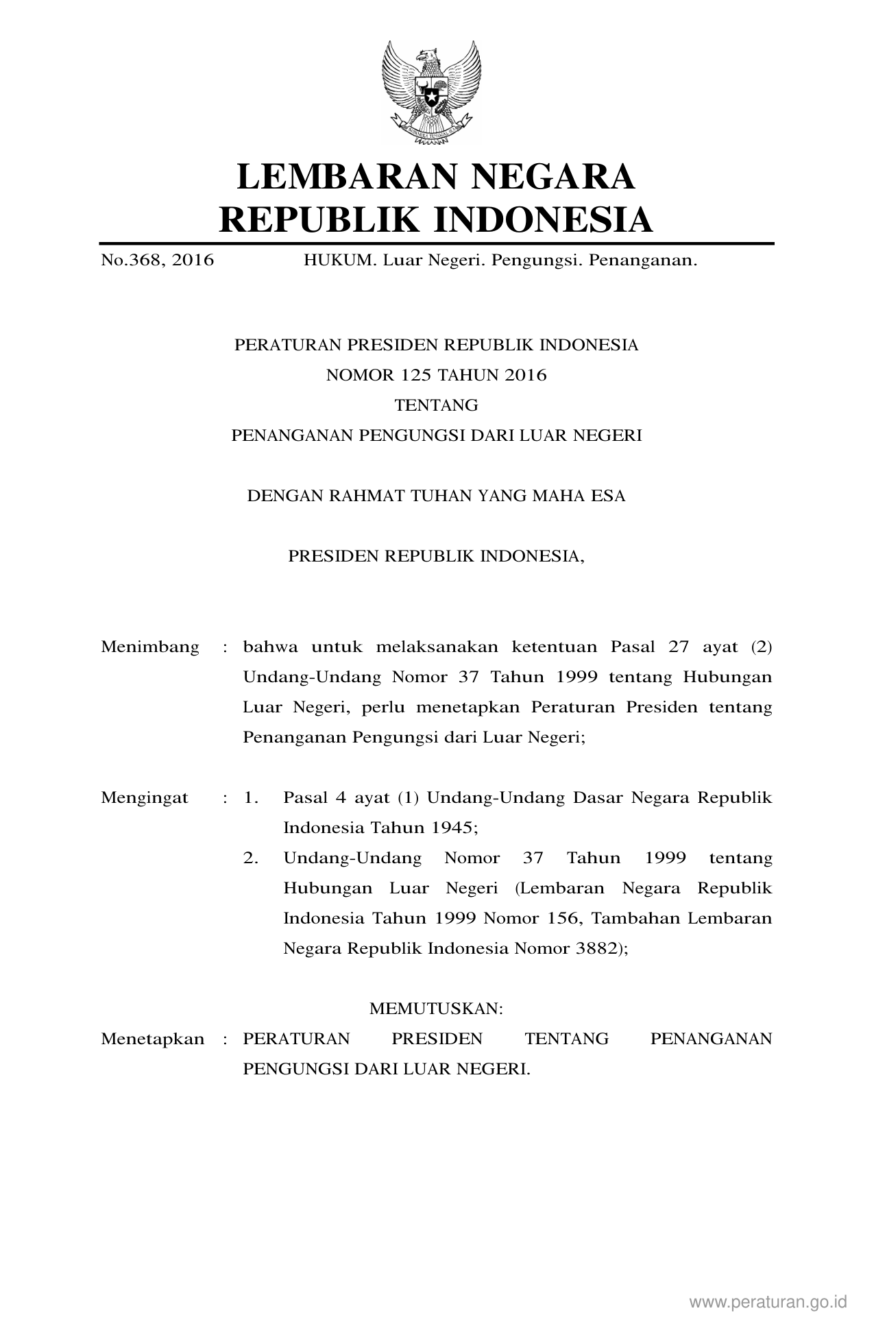 PERPRES Nomor 125 Tahun 2016 | Peraturan Presiden Nomor 125 Tahun 2016 tentang Penanganan Pengungsi Dari Luar Negeri