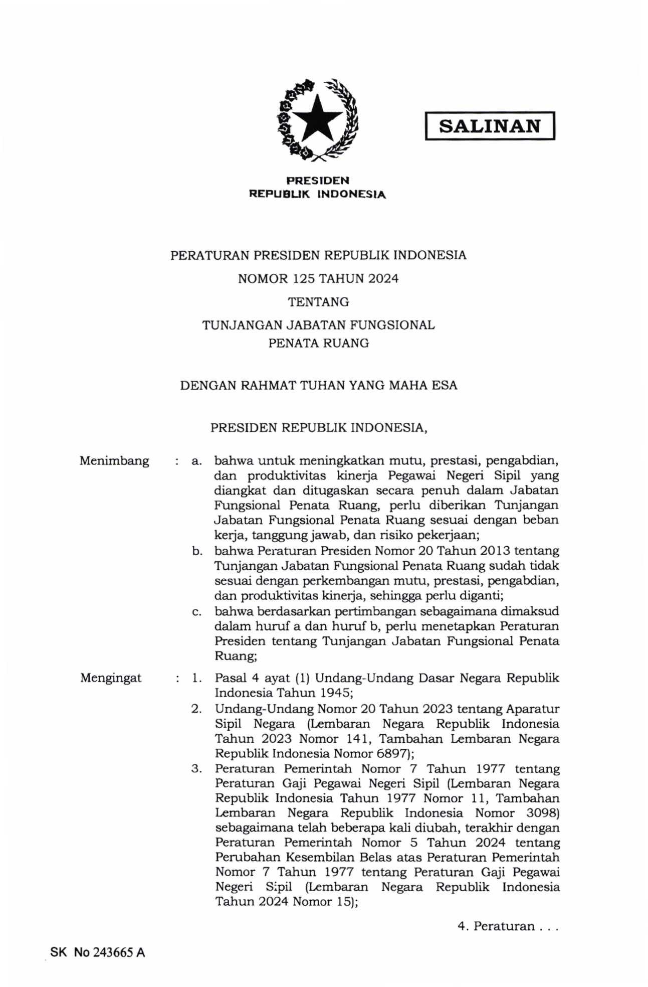 PERPRES Nomor 125 Tahun 2024 | Peraturan Presiden Nomor 125 Tahun 2024 tentang TUNJANGAN JABATAN FUNGSIONAL PENATA RUANG