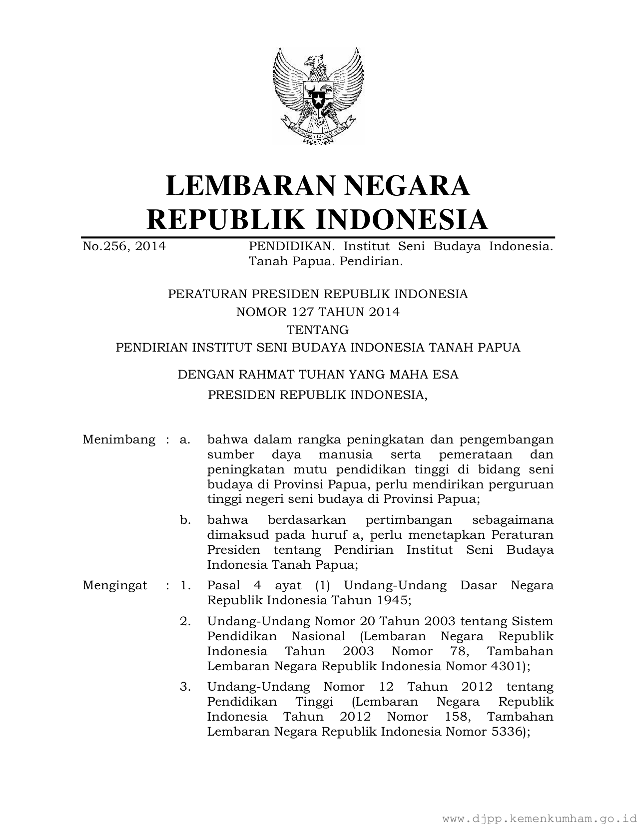 PERPRES Nomor 127 Tahun 2014 | Peraturan Presiden Nomor 127 Tahun 2014 tentang PENDIRIAN INSTITUT SENI BUDAYA INDONESIA TANAH PAPUA