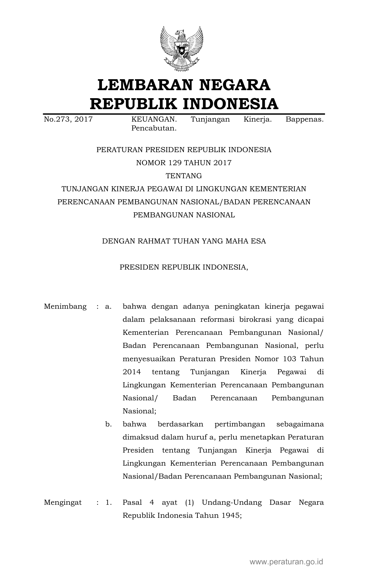 PERPRES Nomor 129 Tahun 2017 | Peraturan Presiden Nomor 129 Tahun 2017 tentang Tunjangan Kinerja Pegawai di Lingkungan Kementerian Perencanaan Pembangunan Nasional/Badan Perencanaan Pembangunan Nasional