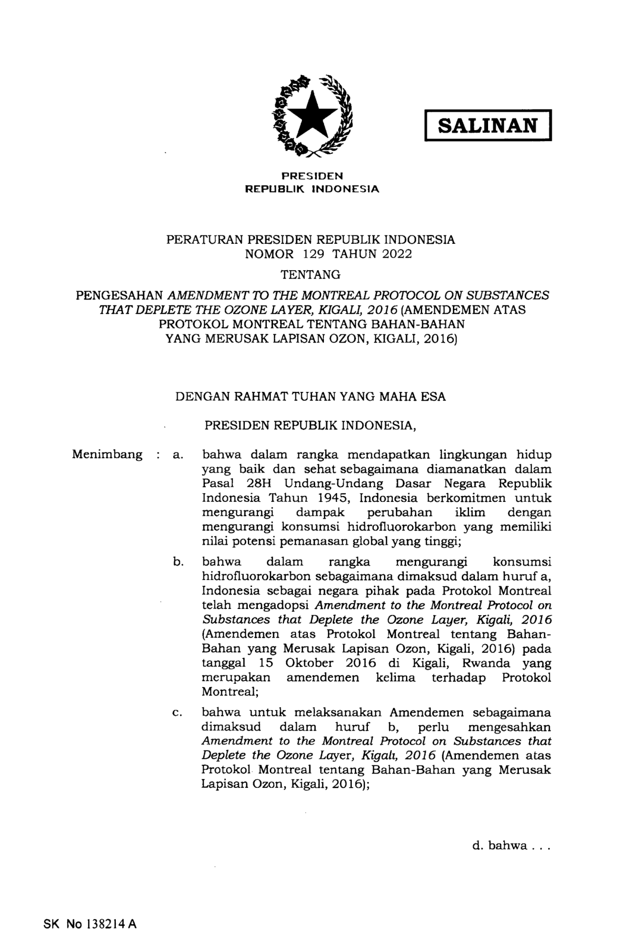 PERPRES Nomor 129 Tahun 2022 | Peraturan Presiden Nomor 129 Tahun 2022 tentang PENGESAHAN AMENDMENT TO THE MONTREAL PROTOCOL ON SUBSTANCES THAT DEPLETE OZONE LAYER, KIGALI,2016 (AMENDEMEN ATAS PROTOKOL MONTREAL TENTANG BAHAN-BAHANYANG MERUSAK LAPISAN OZON, KIGALI, 2016)