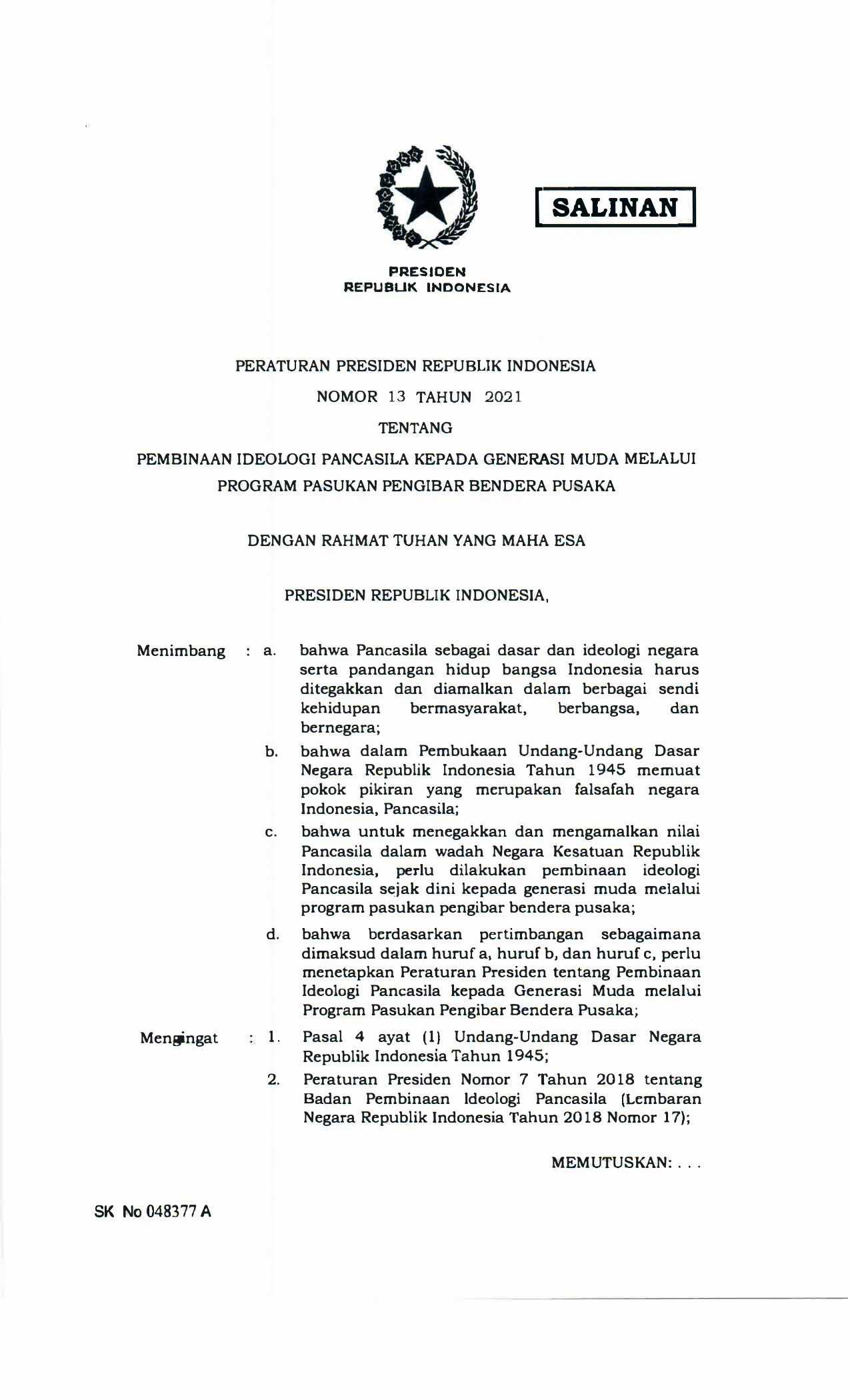 PERPRES Nomor 13 Tahun 2021 | Peraturan Presiden Nomor 13 Tahun 2021 tentang PEMBINAAN IDEOLOGI PANCASILA KEPADA GENERASI MUDA MELALUIPROGRAM PASUKAN PENGIBAR BENDERA PUSAKA