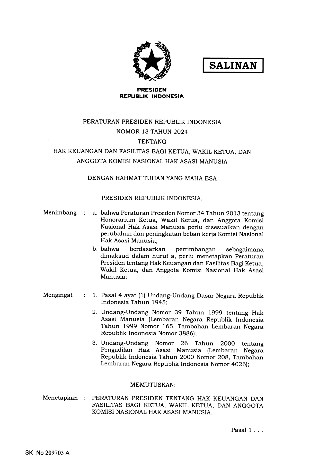 PERPRES Nomor 13 Tahun 2024 | Peraturan Presiden Nomor 13 Tahun 2024 tentang HAK KEUANGAN DAN FASILITAS BAGI KETUA, WAKIL KETUA, DAN ANGGOTA KOMISI NASIONAL HAK ASASI MANUSIA
