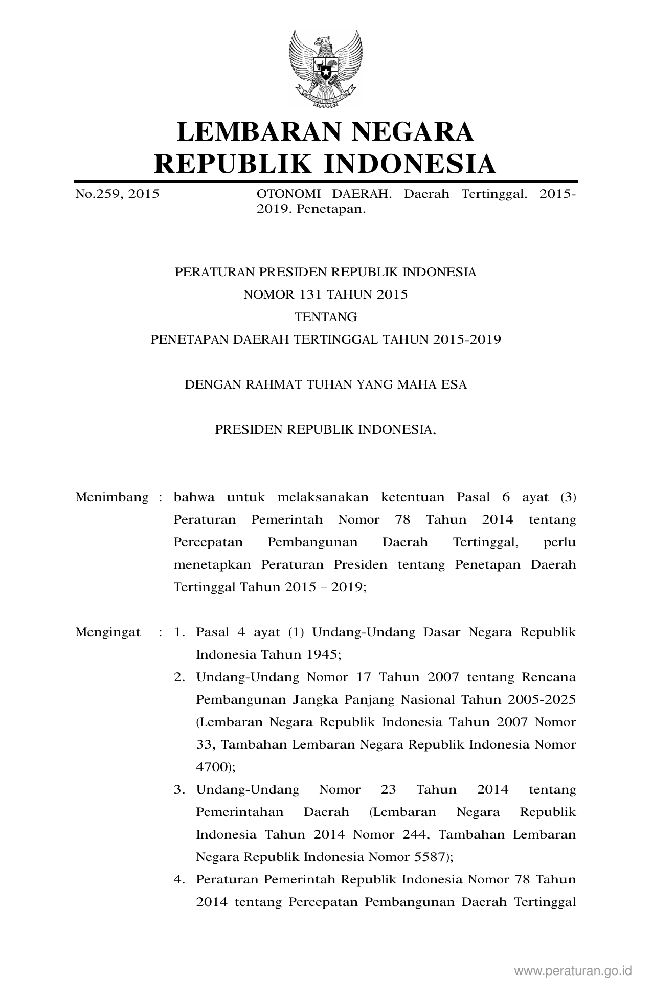 PERPRES Nomor 131 Tahun 2015 | Peraturan Presiden Nomor 131 Tahun 2015 tentang PENETAPAN DAERAH TERTINGGAL TAHUN 20152019