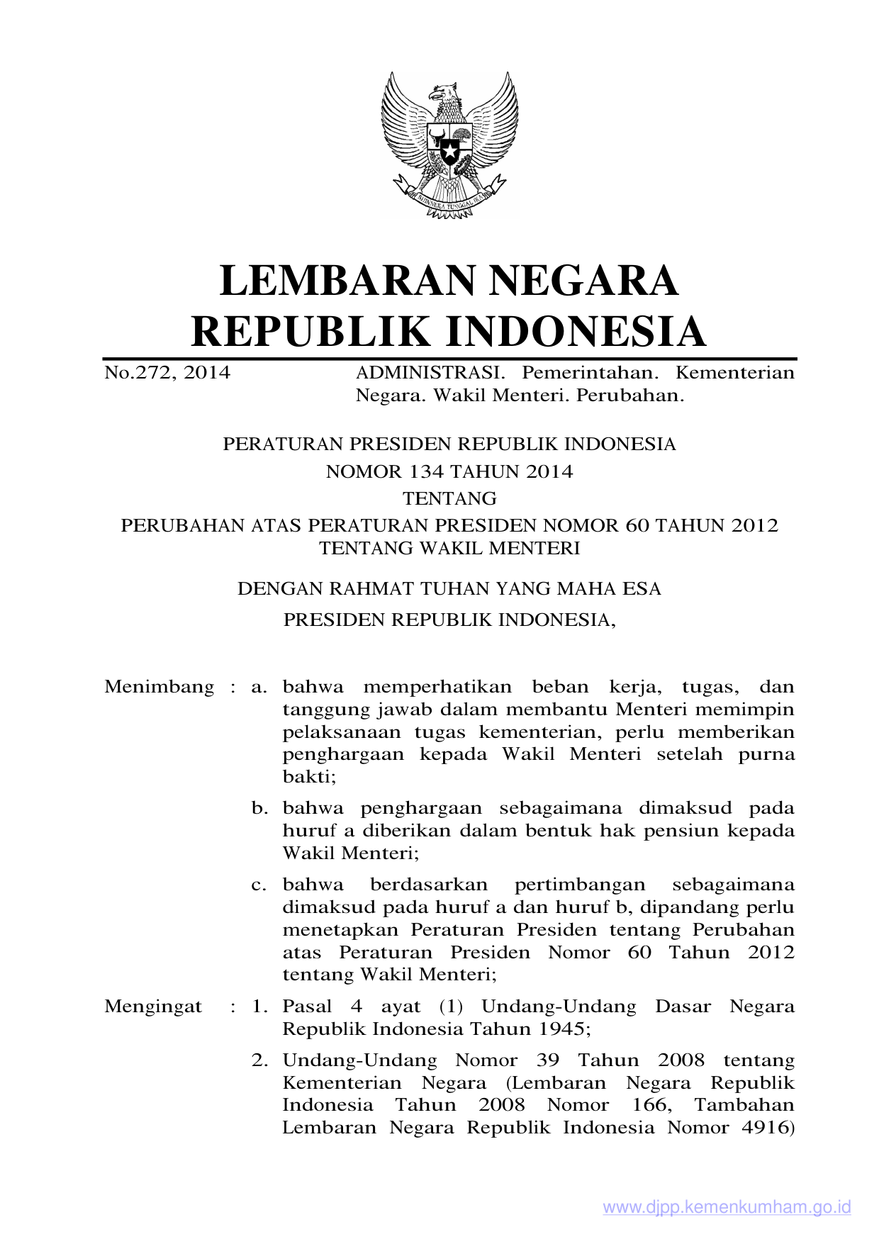 PERPRES Nomor 134 Tahun 2014 | Peraturan Presiden Nomor 134 Tahun 2014 tentang PERUBAHAN ATAS PERATURAN PRESIDEN NOMOR 60 TAHUN 2012 TENTANG WAKIL MENTERI